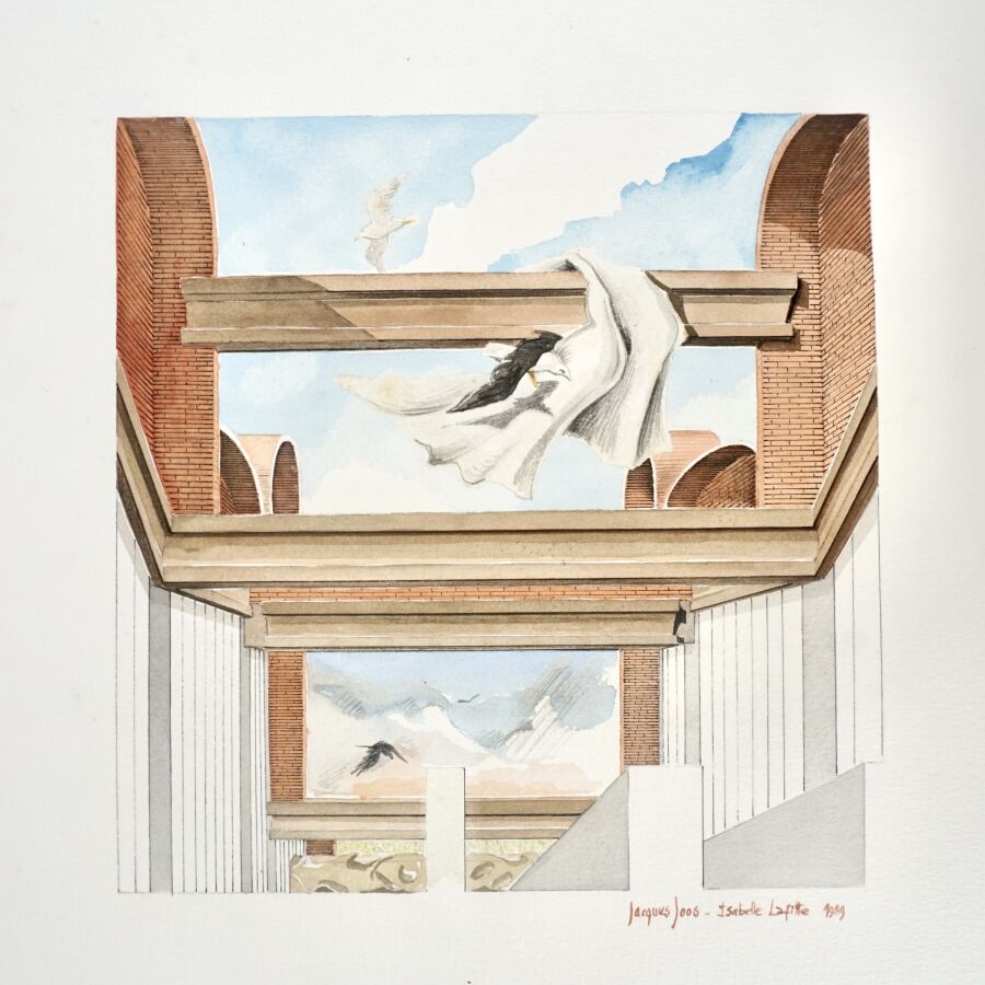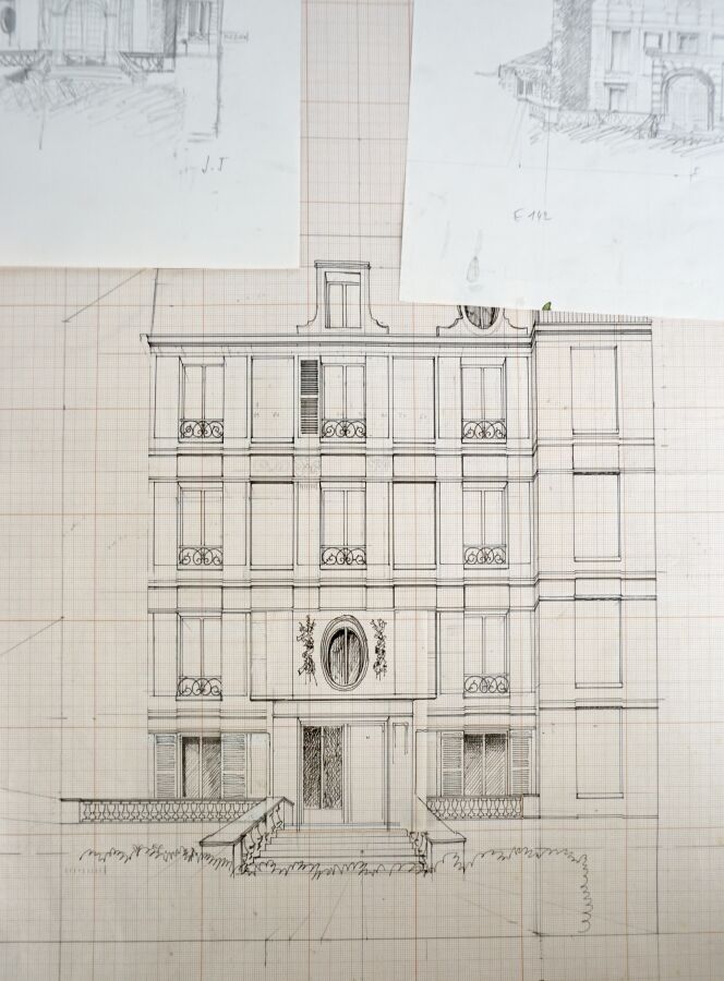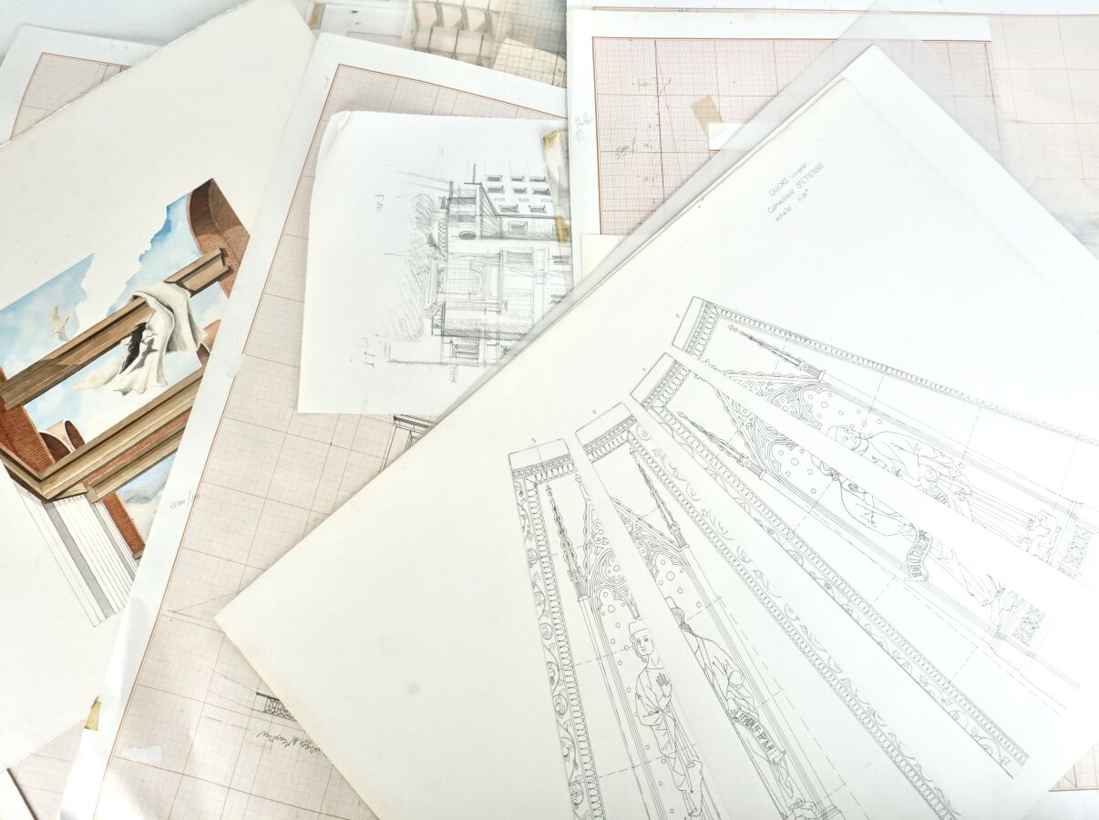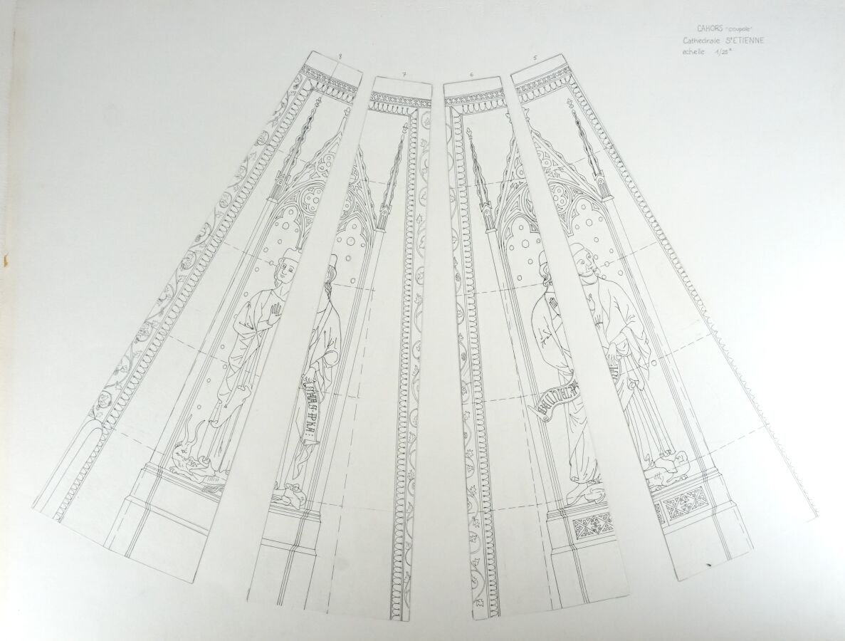 Jacques JOOS (1945-2021), ensemble d'environ une centaine de dessins, aquarelles, découpages, calques et impressions, notamment autour du projet de restauration de la cathédrale Saint Etienne de Cahors (1987-1988) et divers, certains dessins signés, titrés et datés, format divers.
