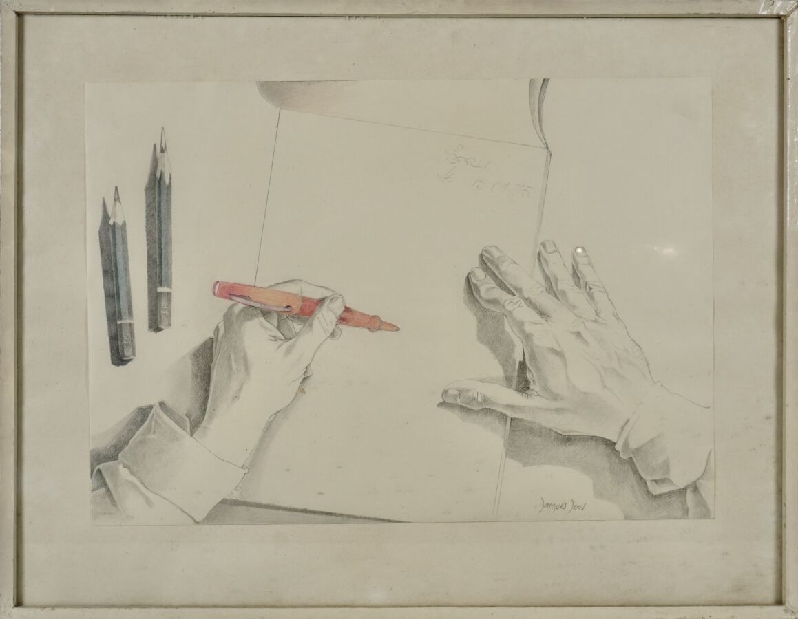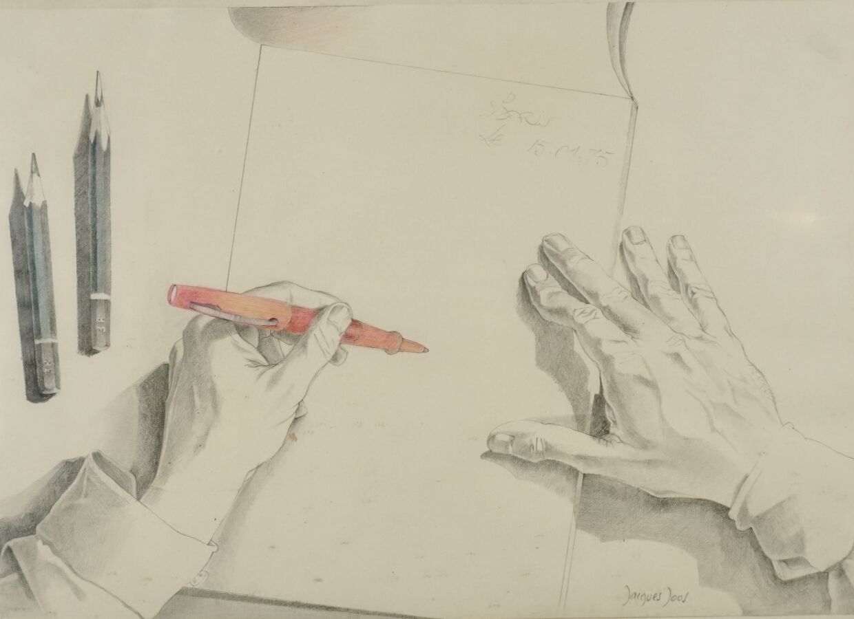 Jacques JOOS (1945-2021), "Etude de mains", 1975, crayons sur papier, signé et daté, 29,5 x 42 cm.