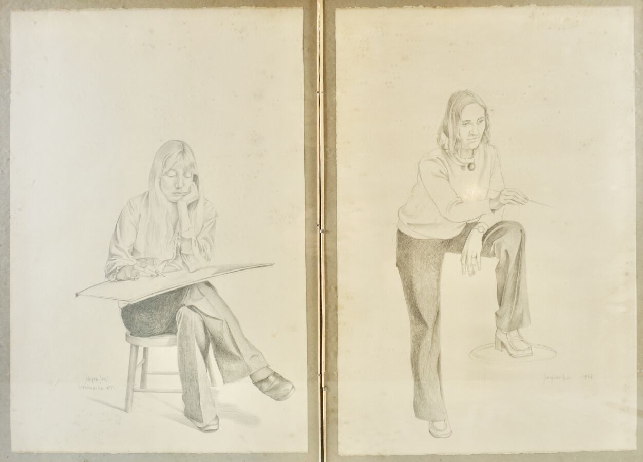 Jacques JOOS (1945-2021), "Etude pour candidats du futur de Mademoiselle Aubert et Chambry", 1977, deux crayons sur papier, signé et daté en bas à droite, 57 x 38 cm.