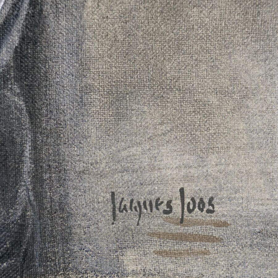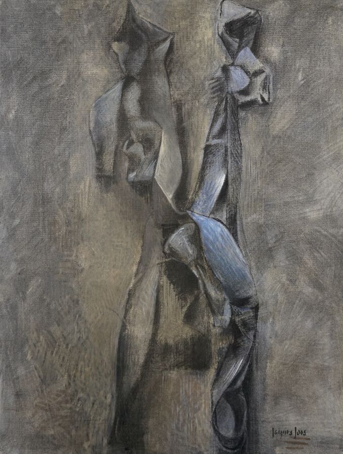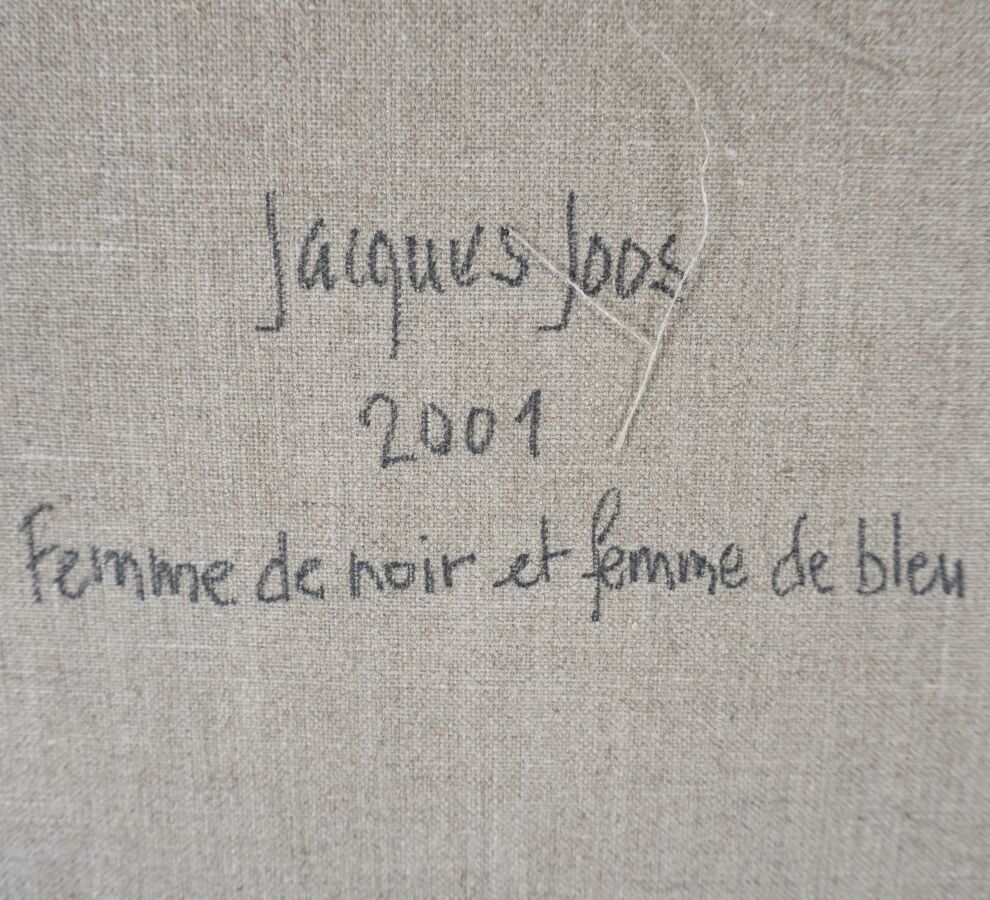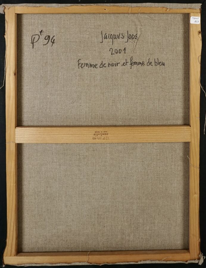 Jacques JOOS (1945-2021), "Femme de noir et femme de bleu", 2001, technique mixte sur toile, signée en bas à droite, signée, titrée et datée au dos, 61 x 46 cm.