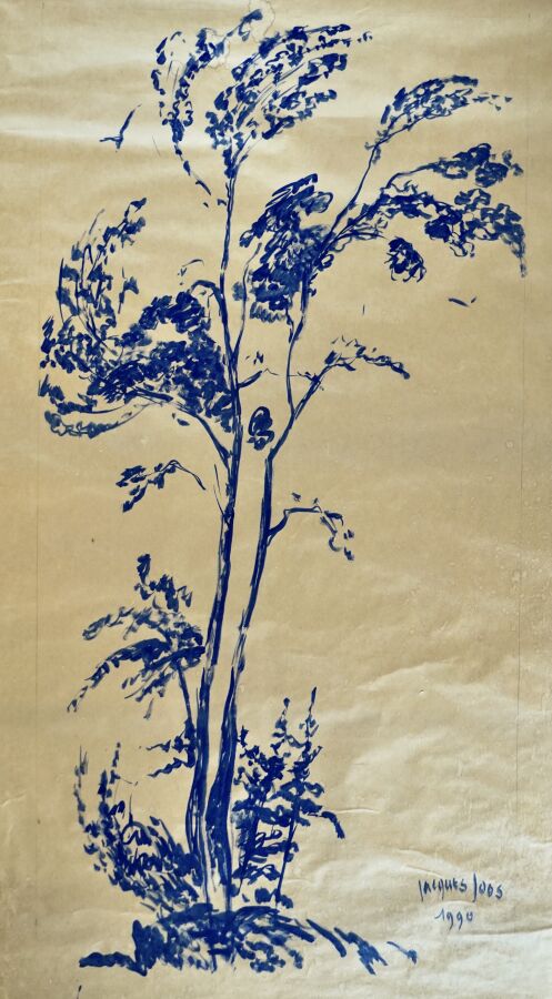 Jacques JOOS (1945-2021), "L'arbre bleu", 1990, gouache sur papier, signée et datée en bas à droite, 215 x 120.5 cm (tâches d'humidités).
