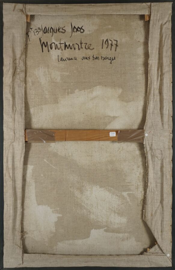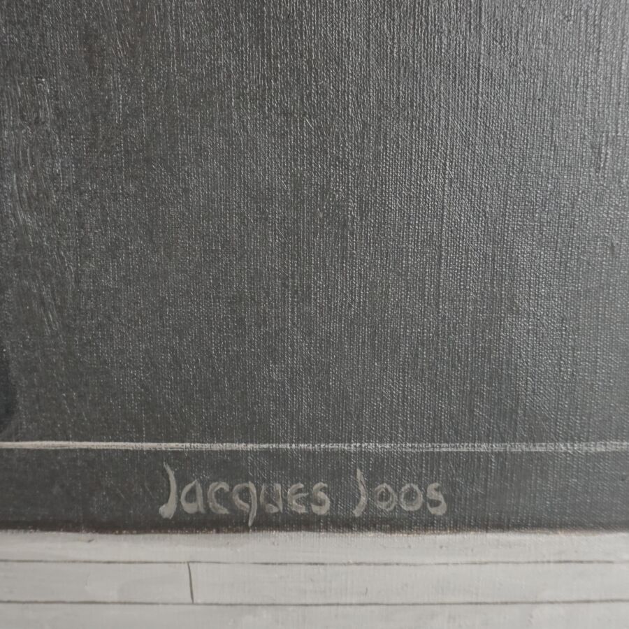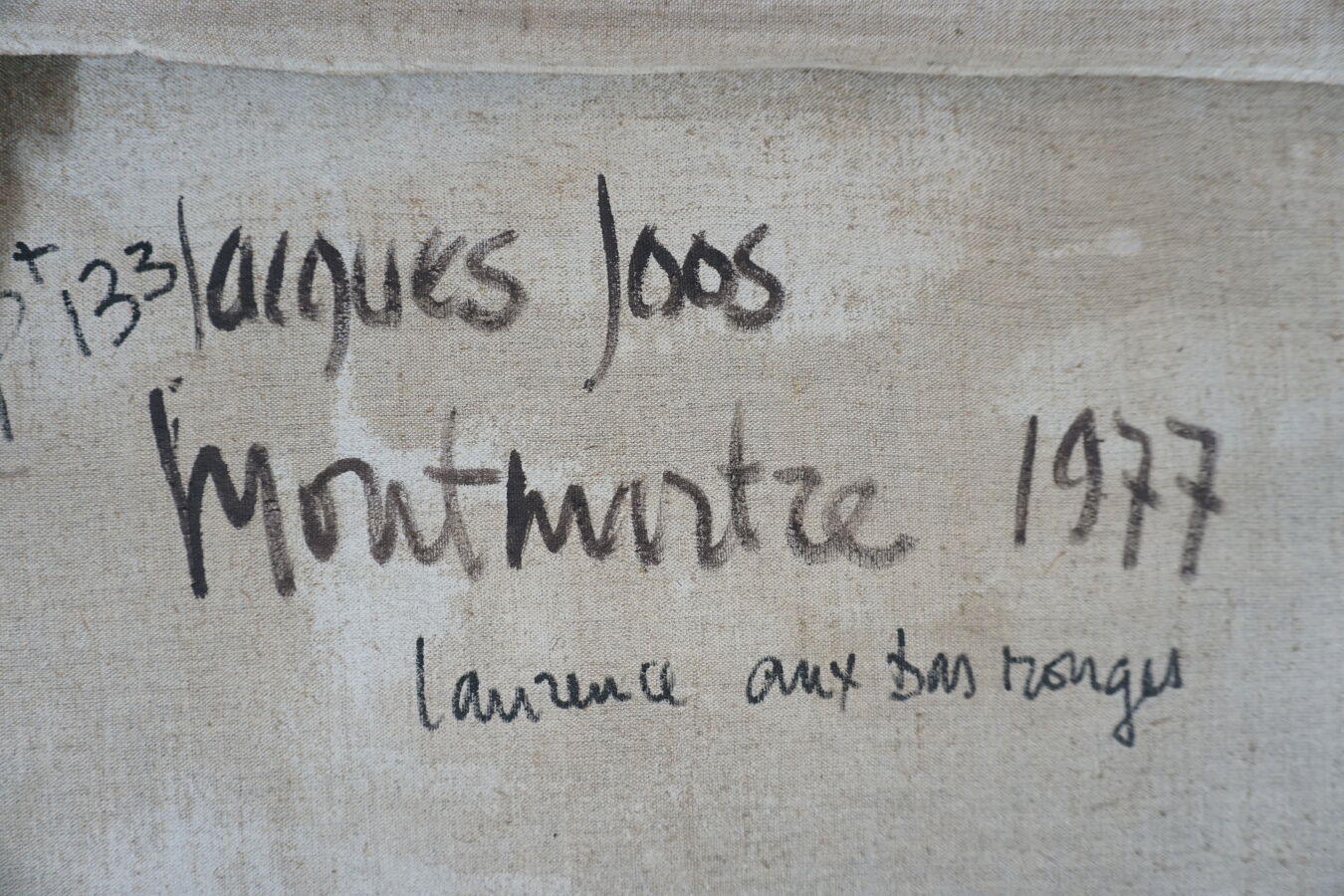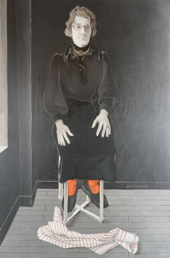 Jacques JOOS (1945-2021), "Laurence aux bas rouges", 1977, huile sur toile, signée en bas à droite, signée, située, titrée et datée au dos, 100 x 65 cm.