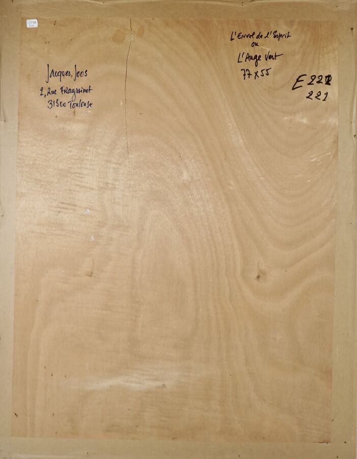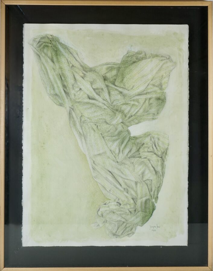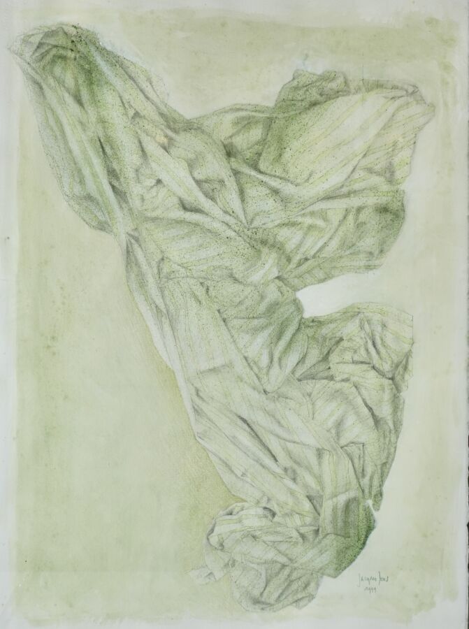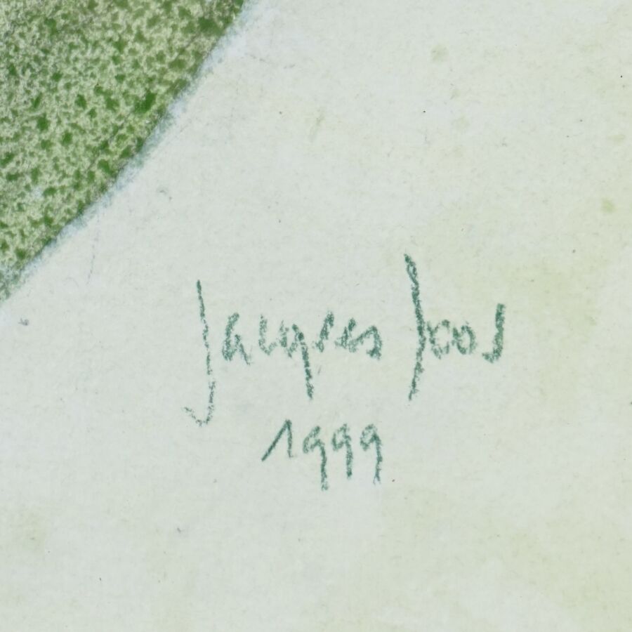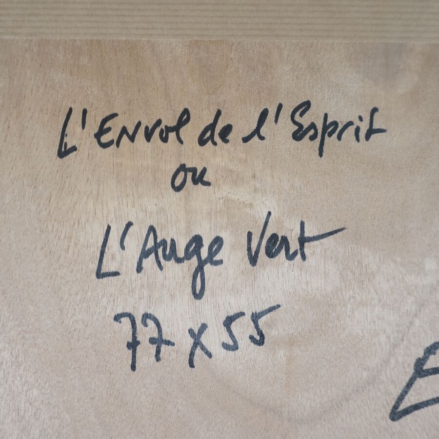 Jacques JOOS (1945-2021), "L'envole de l'esprit ou l'auge vert", 1999, technique mixte sur papier, signée et datée en bas à droite, titrée, située au dos, 77 x 55 cm.