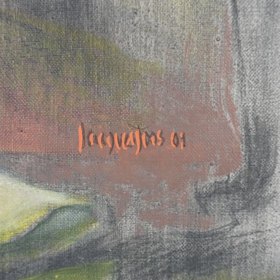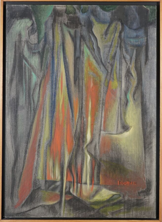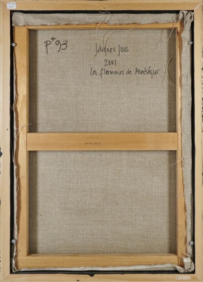 Jacques JOOS (1945-2021), "Les flammes de Montségur", 2001, technique mixte sur toile, signée en bas à droite, signée, titrée et datée au dos, 65 x 46 cm.