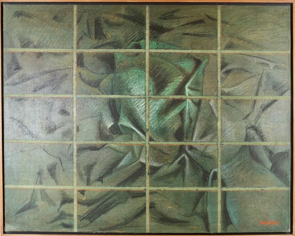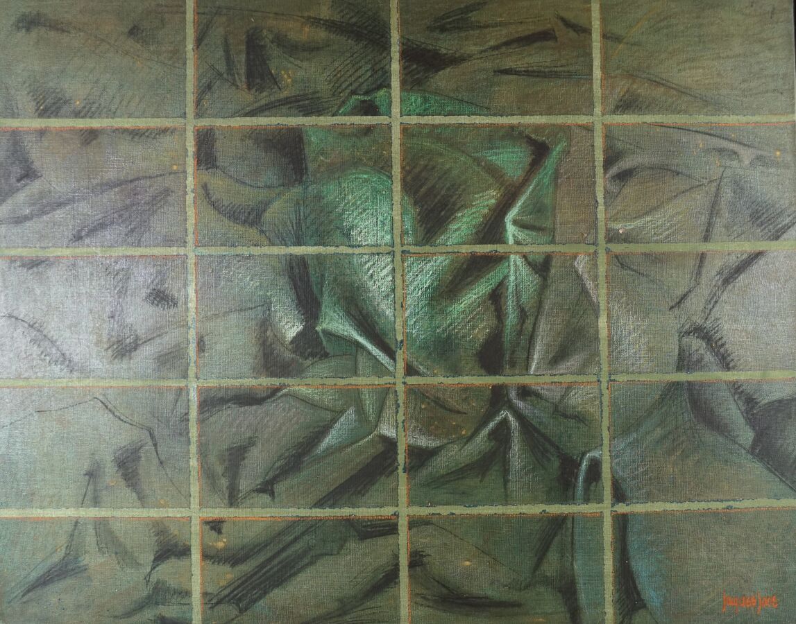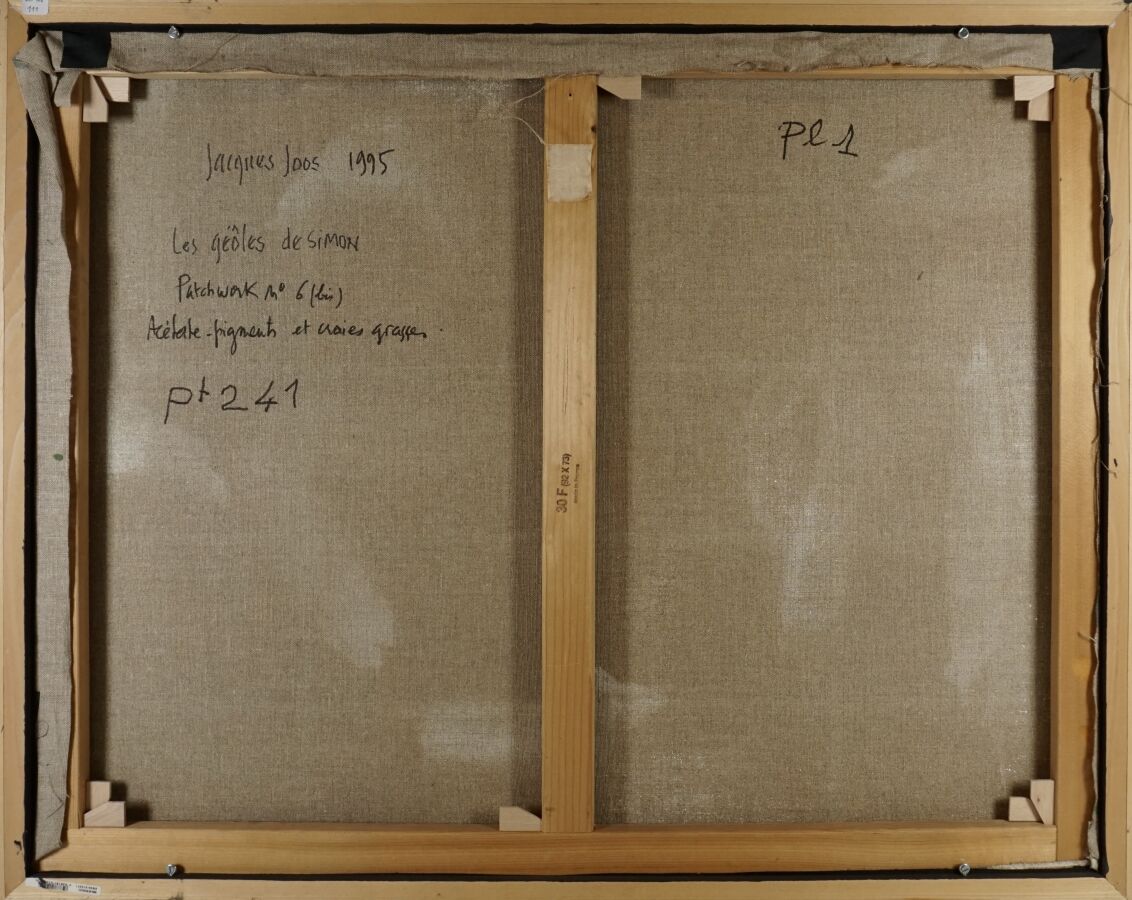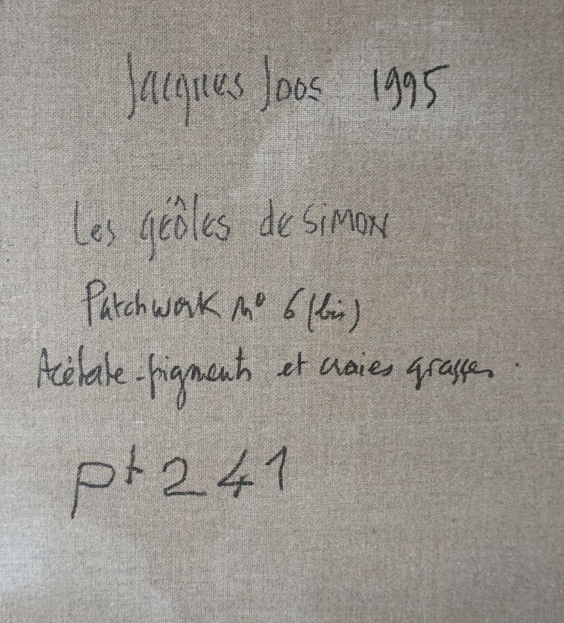 Jacques JOOS (1945-2021), "Les geôles de Simon - Patchwork n°6 bis", 1995, technique mixte sur toile, signée en bas à droite, signée, titrée et datée au dos, 73 x 92 cm.