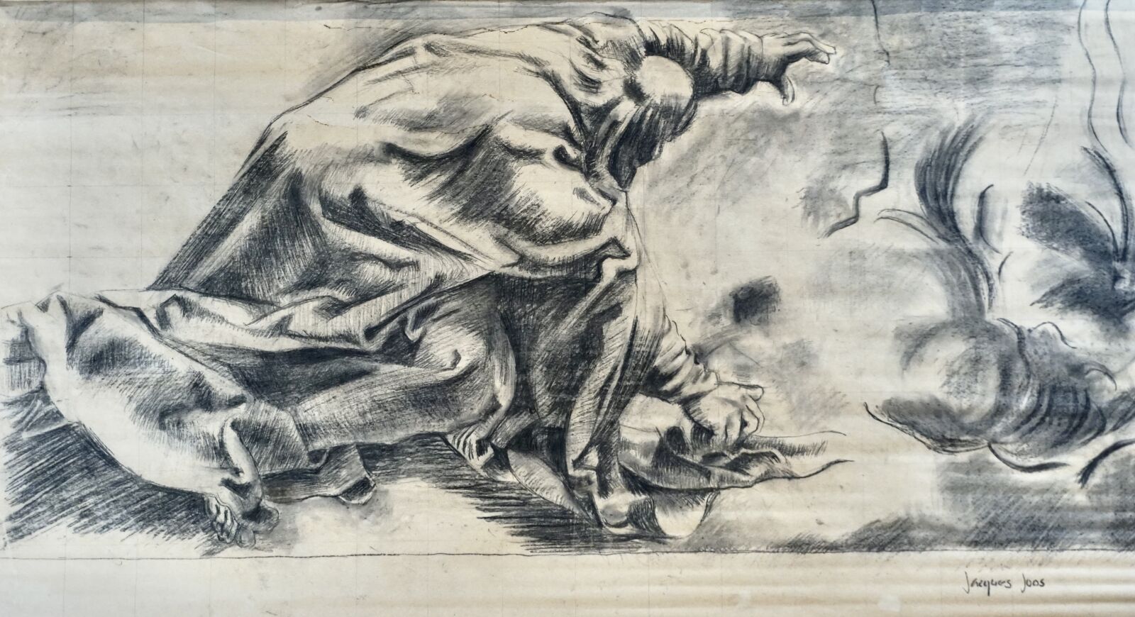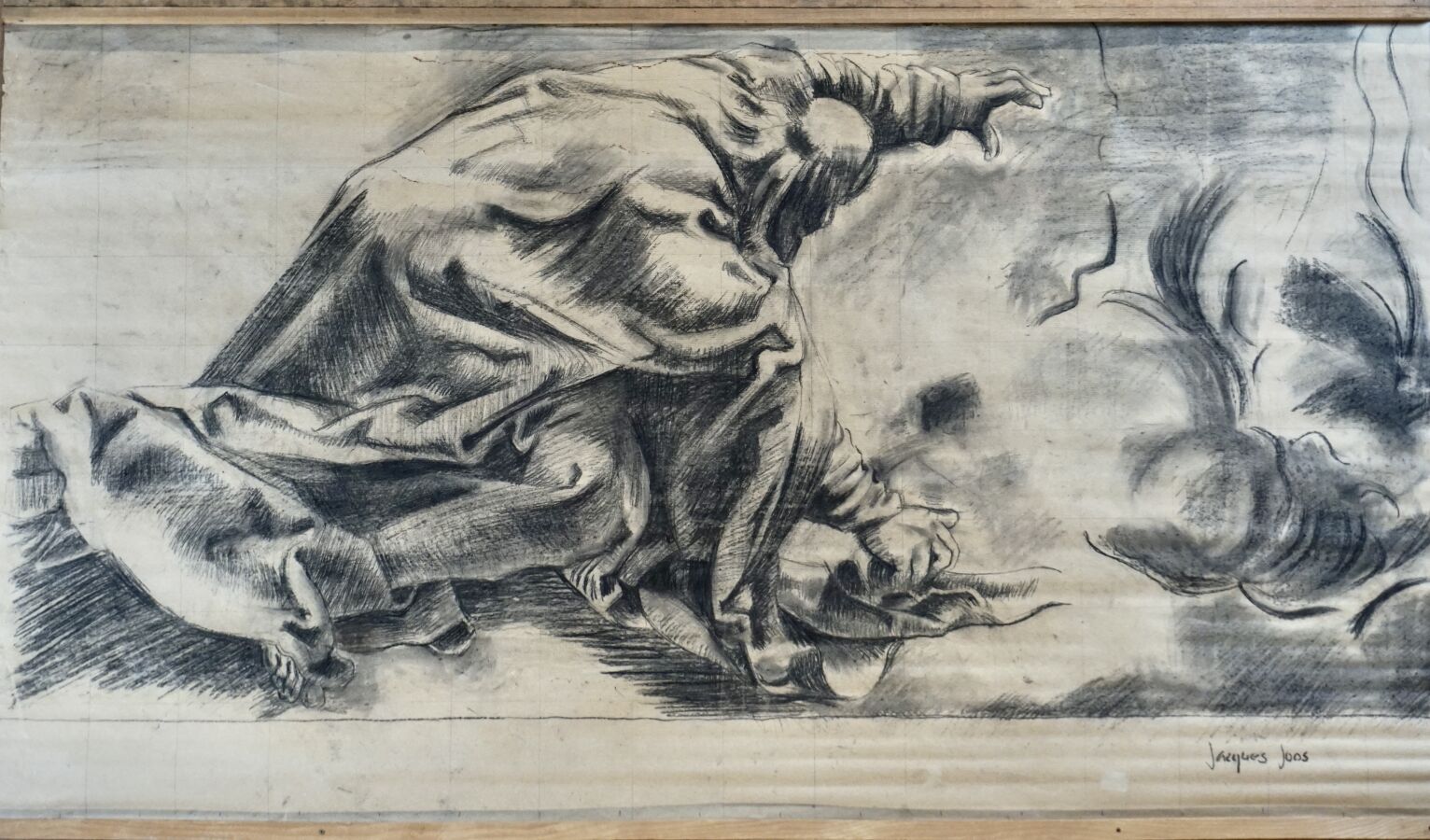 Jacques JOOS (1945-2021), "Moïse devant le buisson ardent", fusain sur papier canson, signé en bas à droite 109 x 197 cm. (déchirures et tâches)