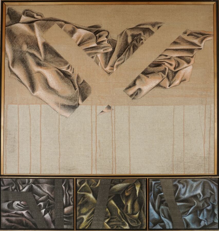 Jacques JOOS (1945-2021), "Multiples drapés", 1989-1990, technique mixte sur toile, signée et datée au dos, 106 x 103 cm.