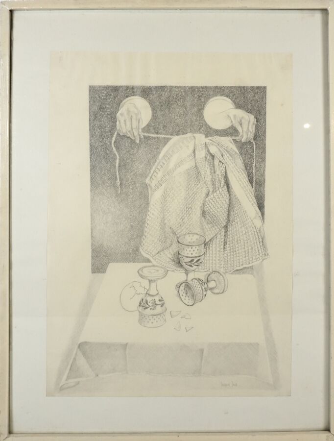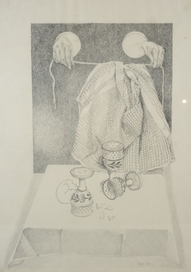 Jacques JOOS (1945-2021), "Nature morte aux verres", crayon sur papier, signée en bas à droite, 41,5 x 30 cm.