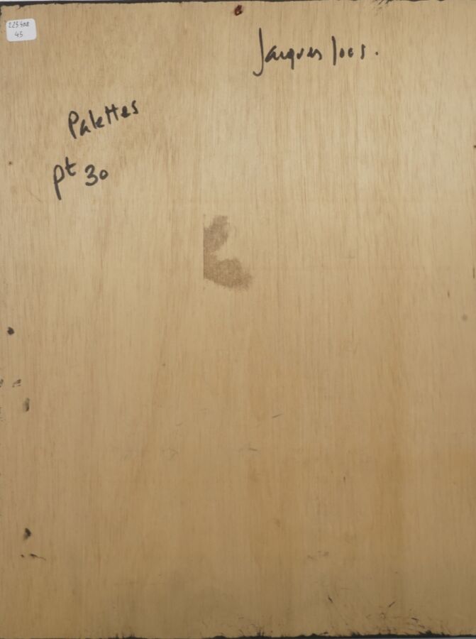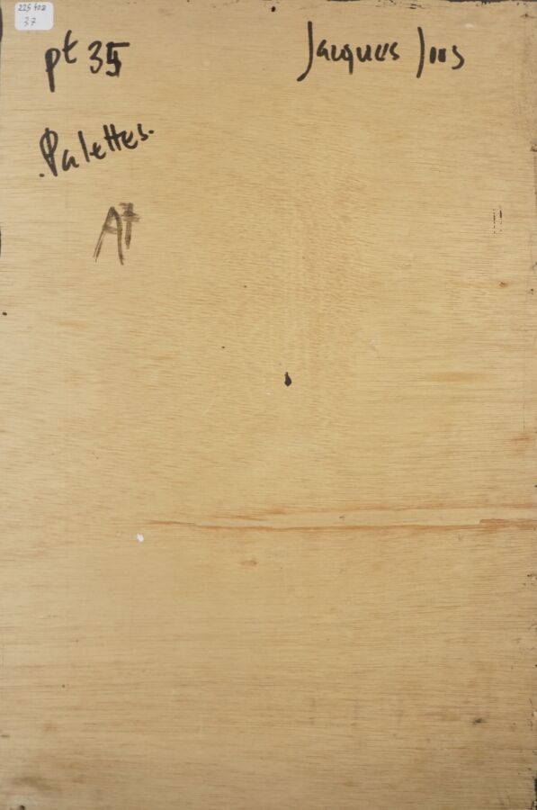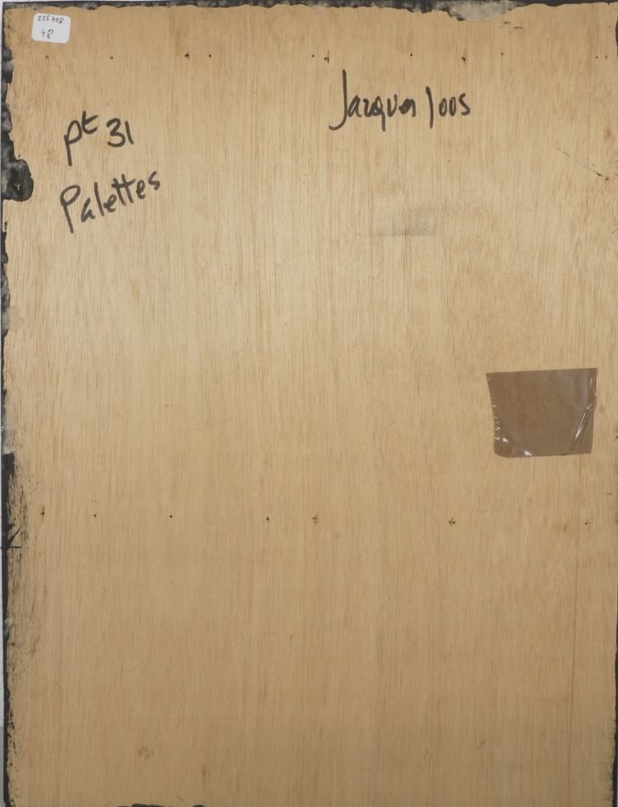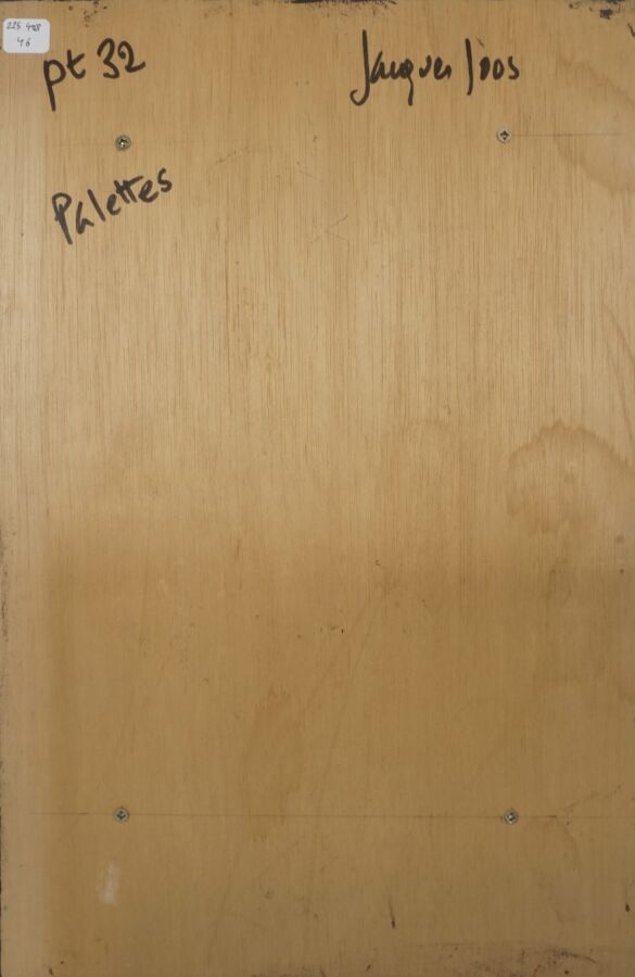 Jacques JOOS (1945-2021), "Palettes", ensemble de six palettes décoratives, technique mixte, signées au dos, encadrées, 41 à 47,5 x 26 à 31 cm.