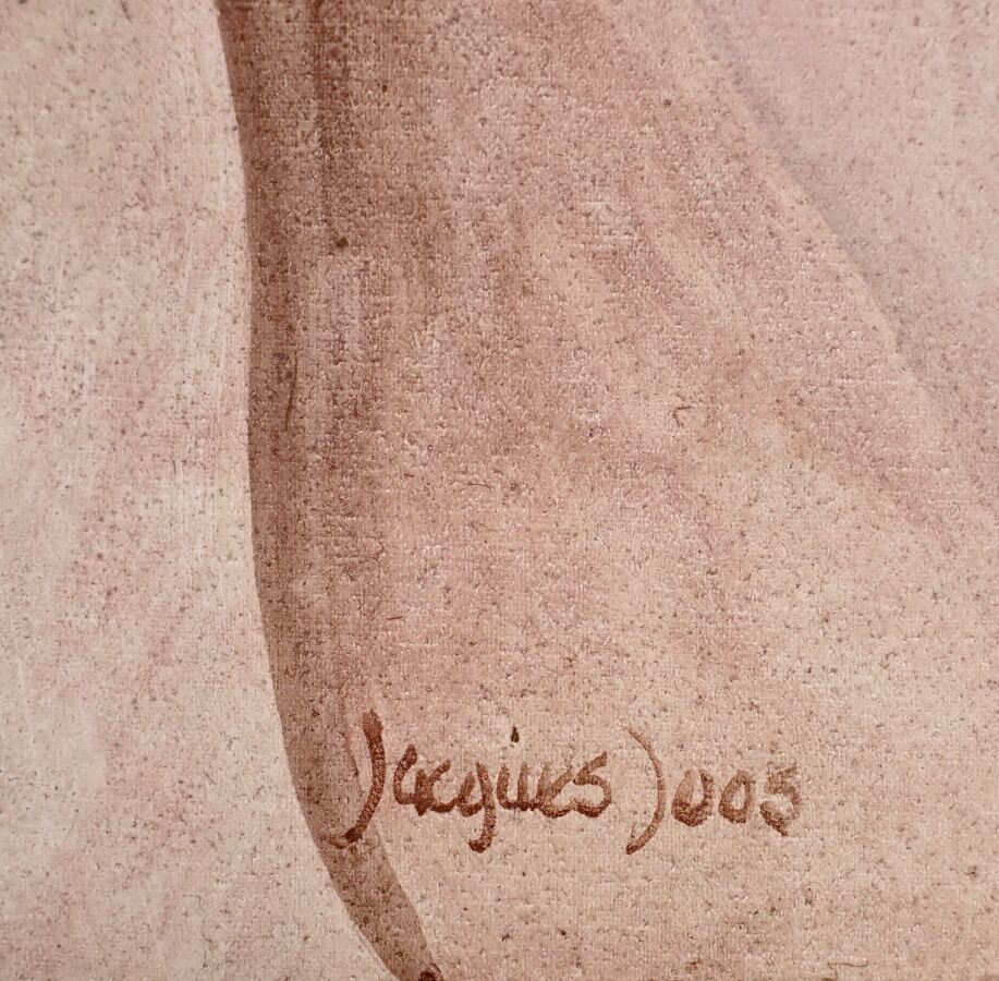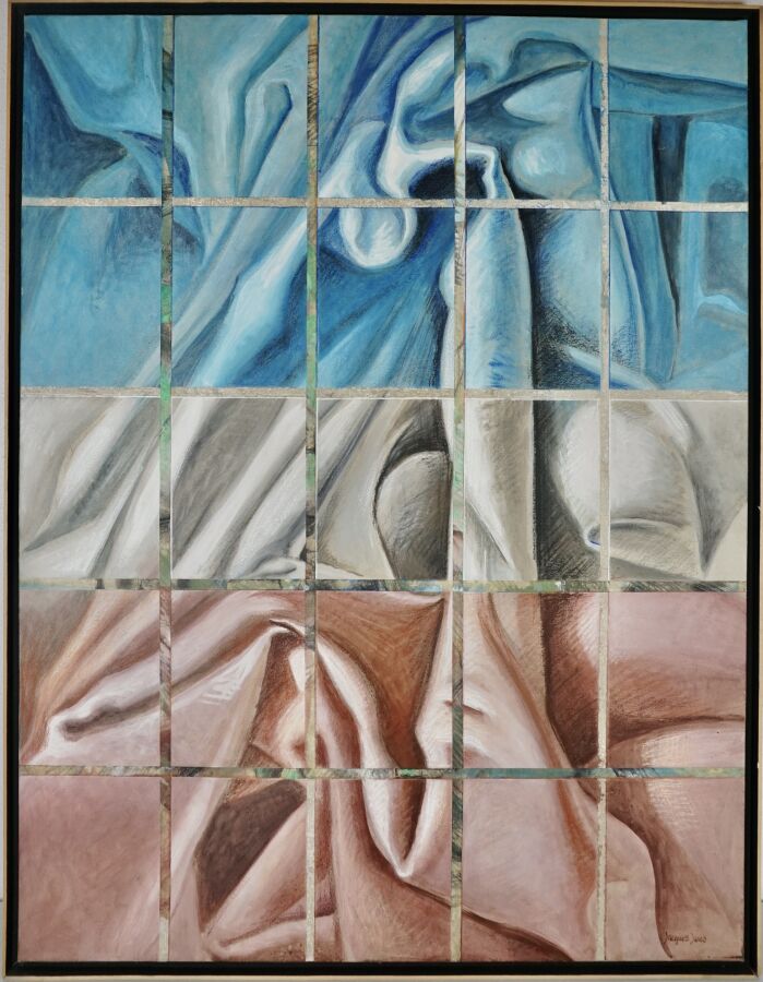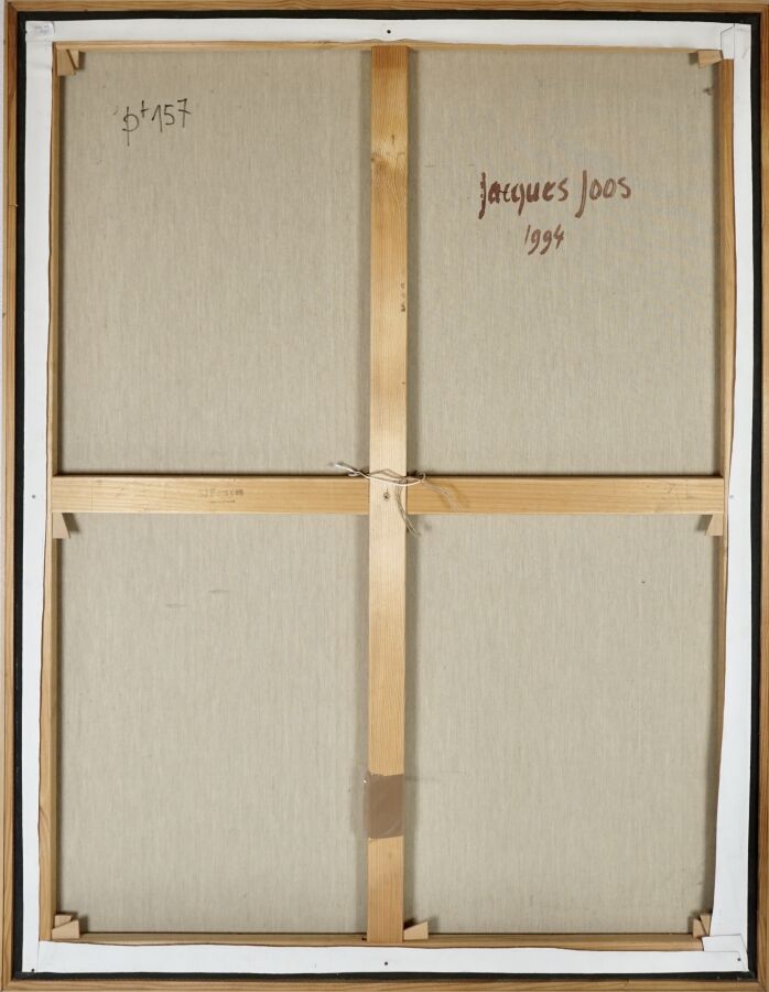 Jacques JOOS (1945-2021), "Patchwork vert, blanc, rose", 1994, technique mixte sur toile, signée en bas à droite, signée et datée au dos, 116 x 89 cm.