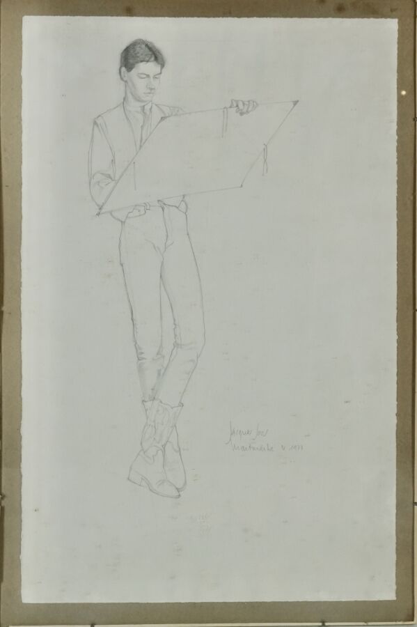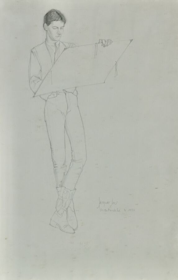 Jacques JOOS (1945-2021), "Portrait aux santiags", 1977, crayon sur papier, signé, daté et situé en bas à droite, 51 x 32,5 cm, "Portrait de Laurence", 1975, crayon sur papier avec réhauts de vert, signé en bas à droite, signée, datée et titrée au dos du cadre, 73 x 53 cm, et "Etude pour les halles de Bezièze, mars 2000", calque, signé et titré en bas à gauche, 29 x 67 cm.