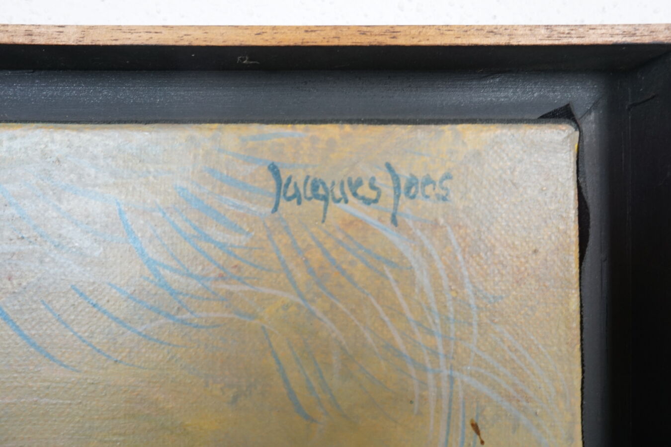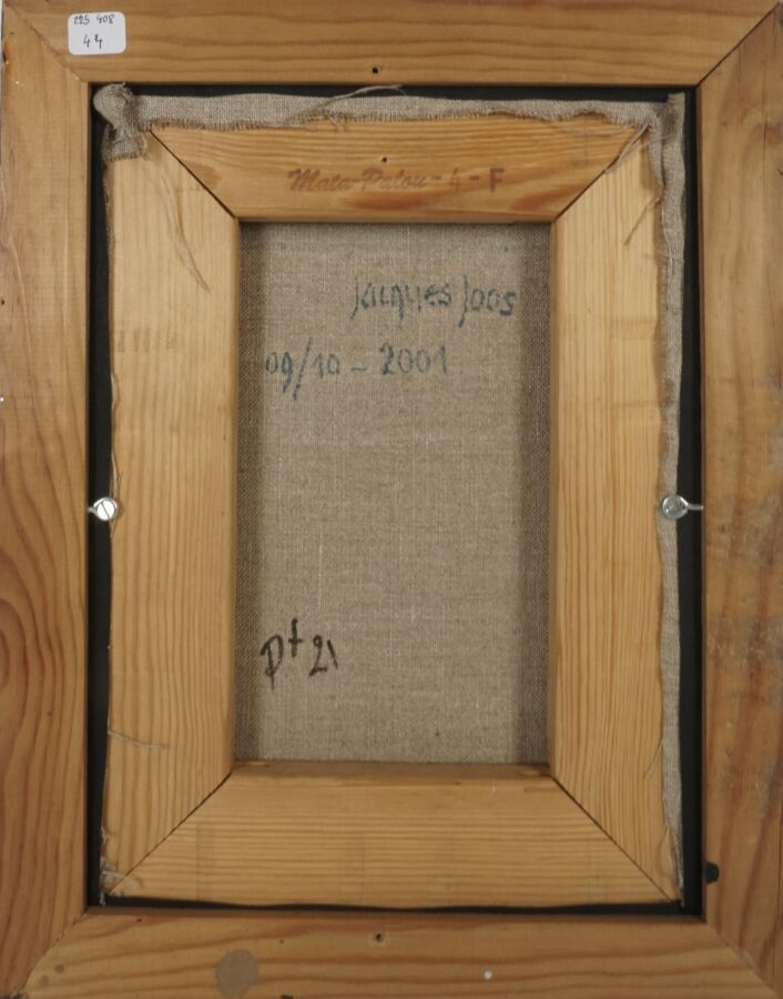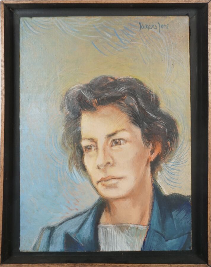 Jacques JOOS (1945-2021), "Portrait de femme", 2001, technique mixte sur toile, signée en haut à droite et signée et datée au dos, encadrée, 30,5 x 23,5 cm.