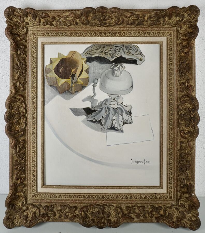 Jacques JOOS (1945-2021), "Sonnette et cendrier", huile sur toile, signée en bas à droite, 46 x 38 cm.