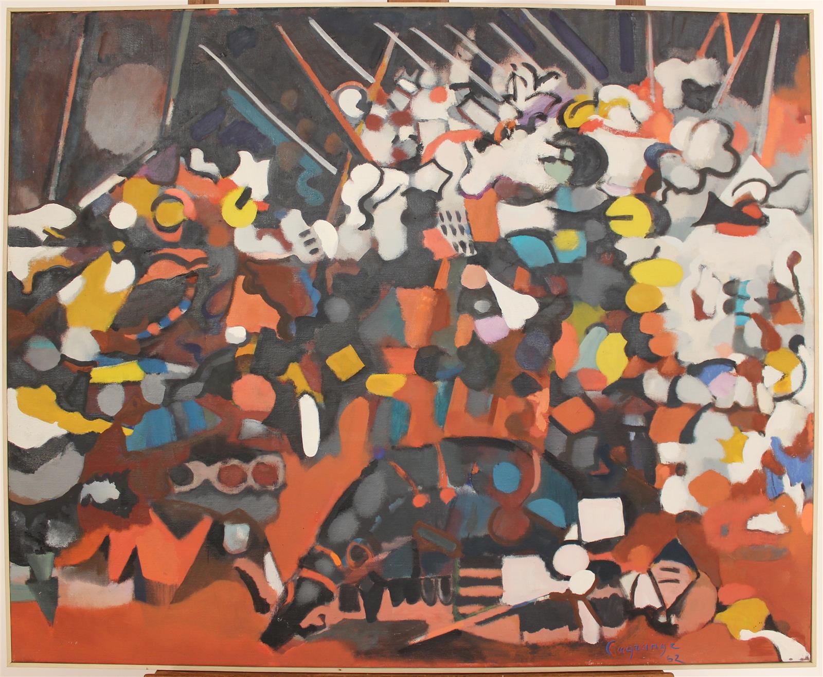 Jacques LAGRANGE (1917-1995), "La vie et la mort d'un chevalier II" 62, huile sur toile, signée et datée en bas à droite, titrée, contresignée et datée au dos, 81 x 100 cm