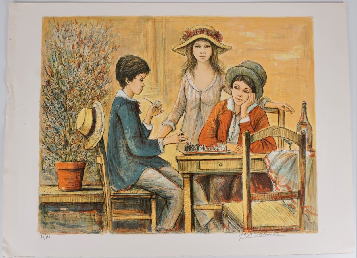 Jacques LALANDE (1921 - 2003), "La partie d'échec" lithographie originale, numérotée 70/190 en bas à gauche et signée en bas à droite dans la marge, 56 x 76 cm.