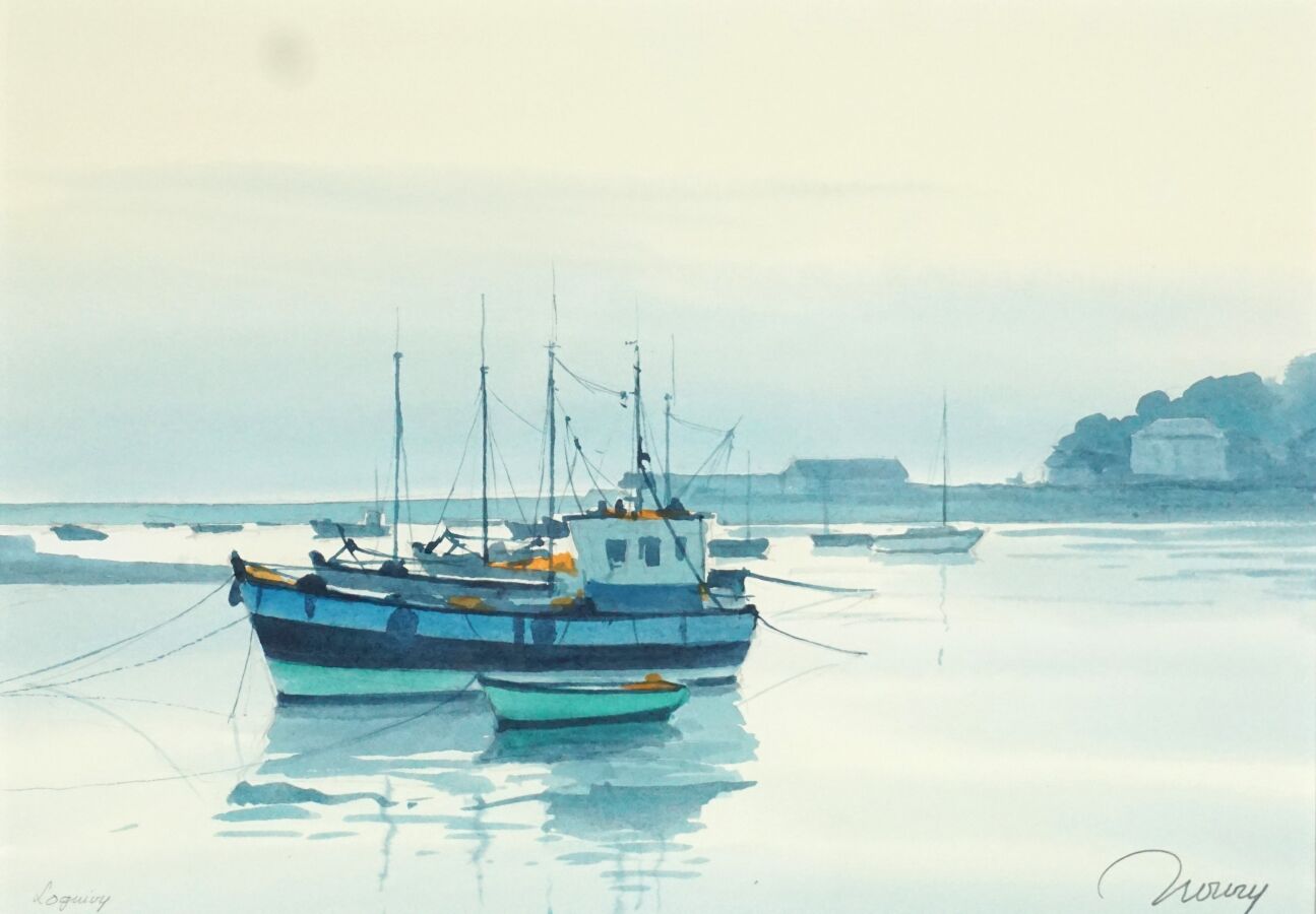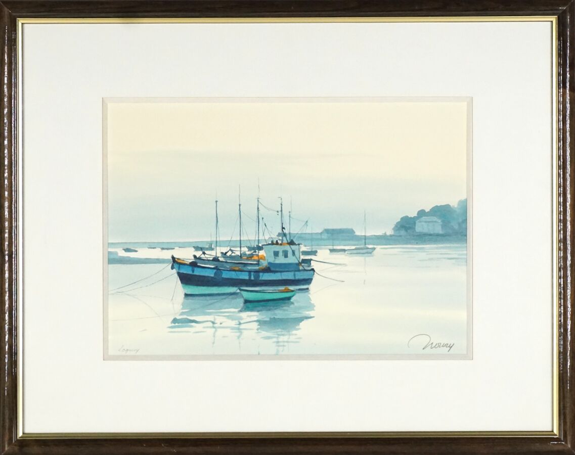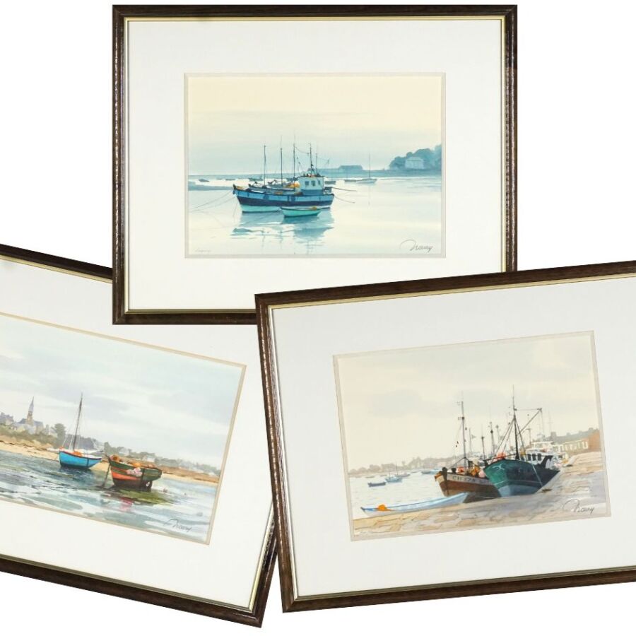 Jacques NOURY (1927-2021), "Loguivy de la Mer", "Ile de Batz" et "Barfleur", trois aquarelles sur papier signées en bas, deux situées en bas à gauche, la troisième située au dos, 21 x 30 cm (à vue).