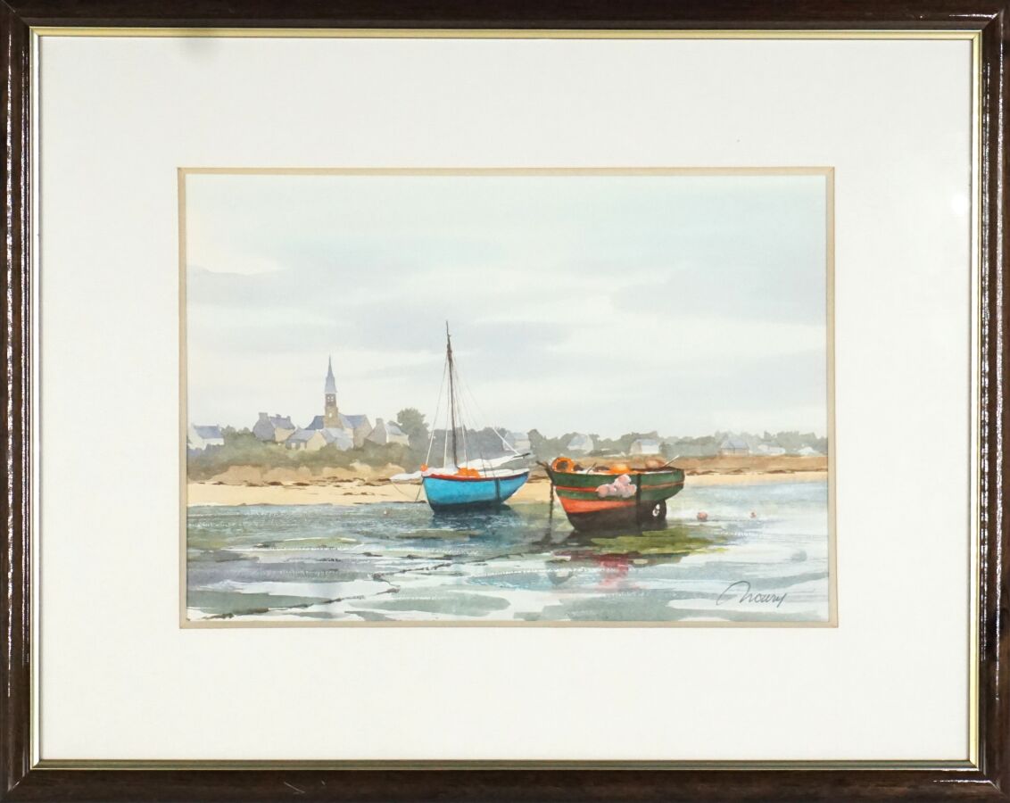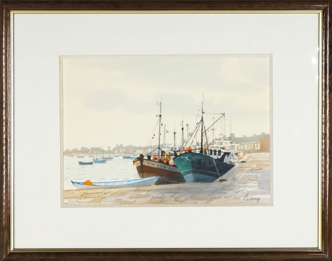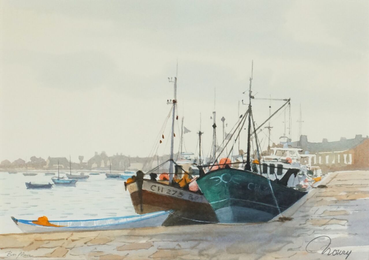 Jacques NOURY (1927-2021), "Loguivy de la Mer", "Ile de Batz" et "Barfleur", trois aquarelles sur papier signées en bas, deux situées en bas à gauche, la troisième située au dos, 21 x 30 cm (à vue).