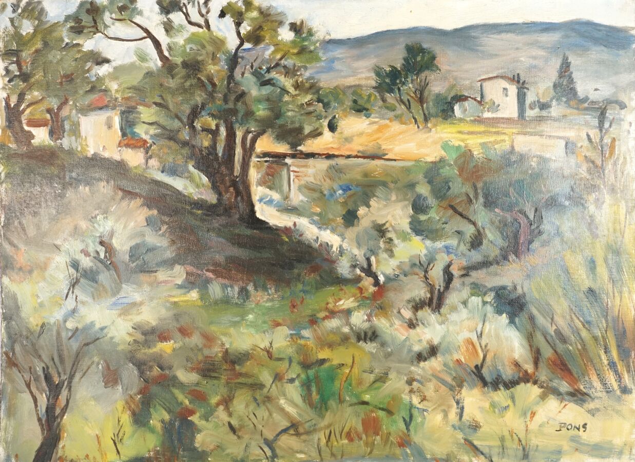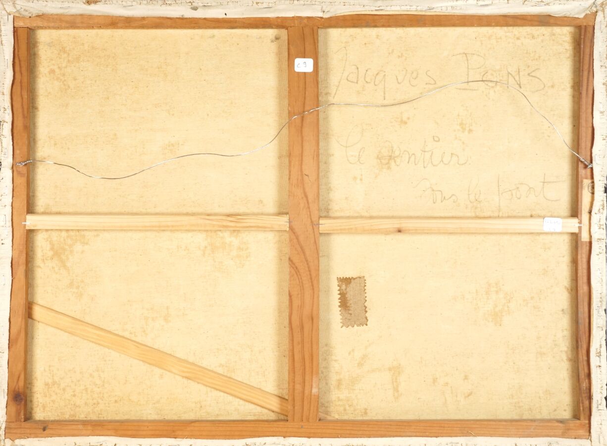 Jacques PONS (1936), "Le sentier sous le pont", huile sur toile signée en bas à droite, contresignée et titrée au dos, 54 x 73 cm (ancienne réparation).