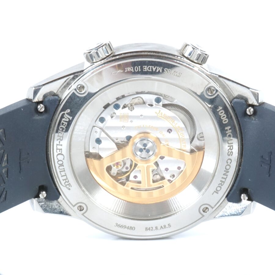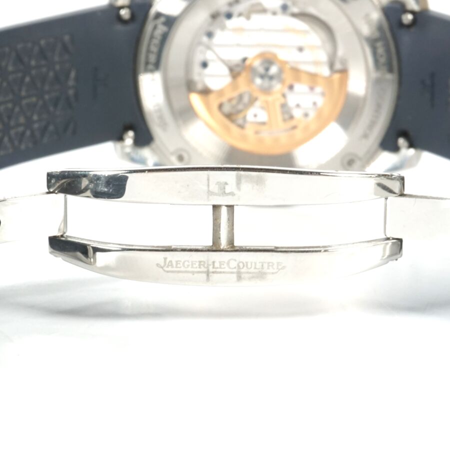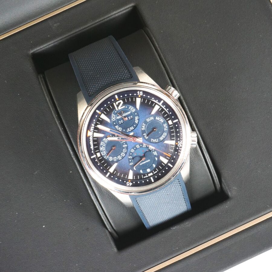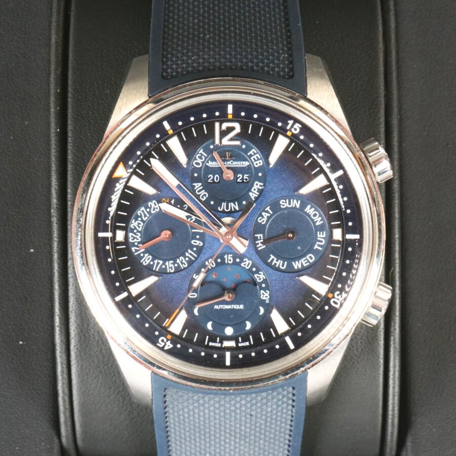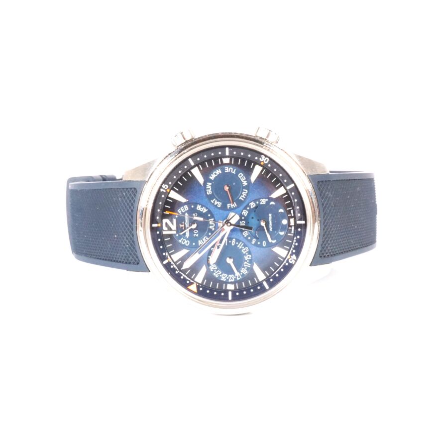 JAEGER LECOULTRE : Montre bracelet modèle "Polaris Perpetual Calendar - QP", boîtier rond en acier 42 mm, cadran bleu grainé nuancé signé, chiffres arabes et index appliqués pour les heures, composé de quatre cadrans, cadran à 12H pour les années et les mois, cadran à 3H pour les jours, cadran à 6H pour les indications phases de lune avec visualisation et cadran dateur à 9H, fond à vis squelette, signé et numéroté 3669480, bracelet d'origine bleu en caoutchouc et boucle déployante logotée, mouvement mécanique à remontage automatique, présentée dans son coffret d'origine contenant un bracelet articulé en acier à boucle déployante logotée avec ses maillons supplémentaires, avec sa surboîte, sa facture, sa carte de garantie en date du 3 septembre 2022, son stylet d'origine, son étiquette de boutique et ses documents (en état de fonctionnement, très bel état).
