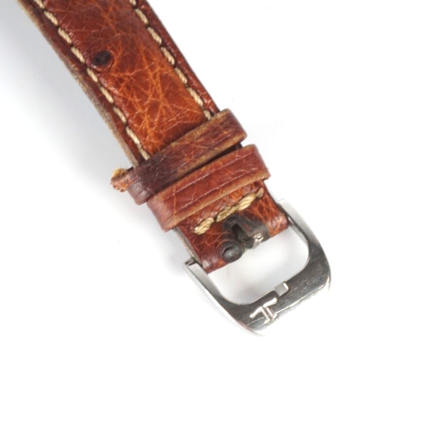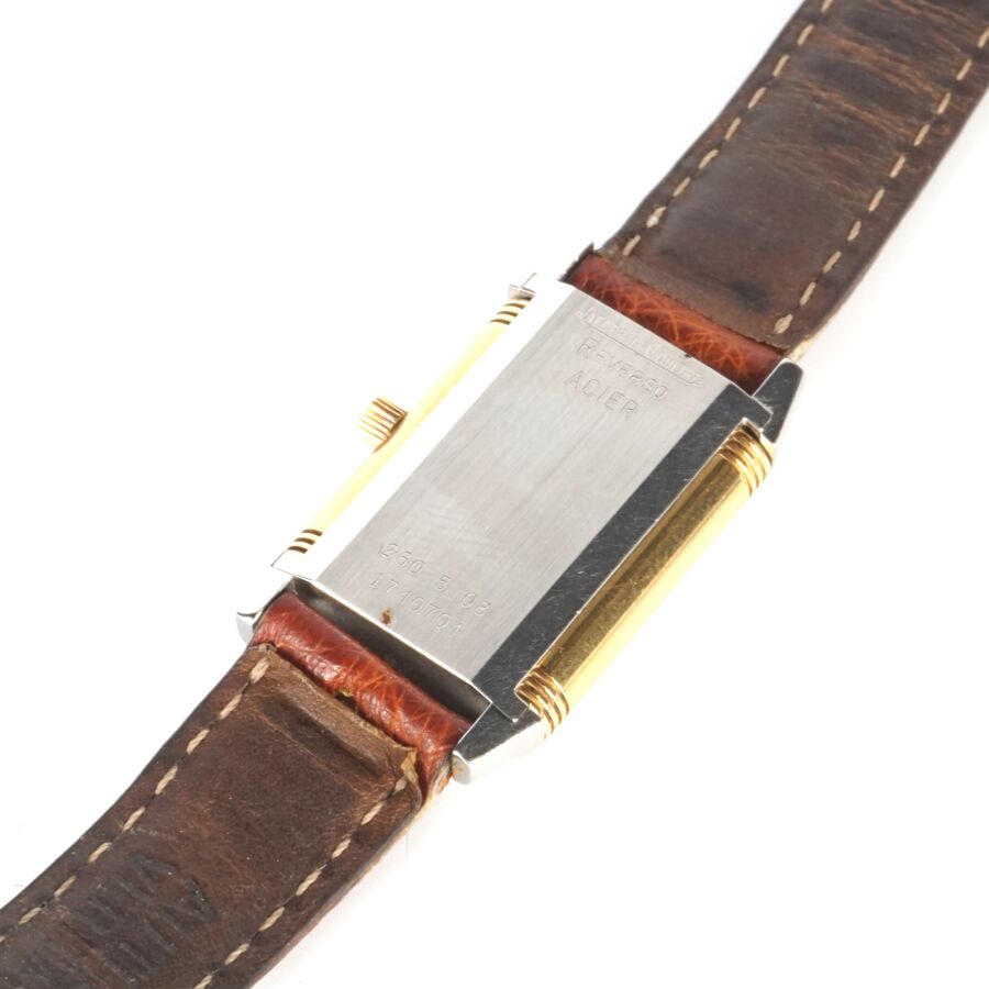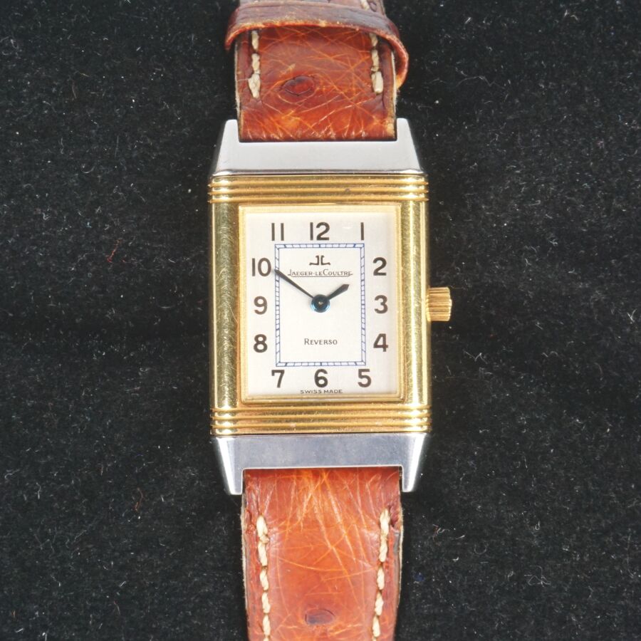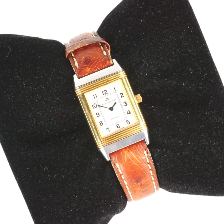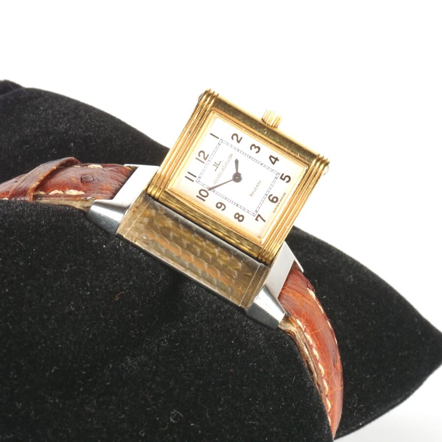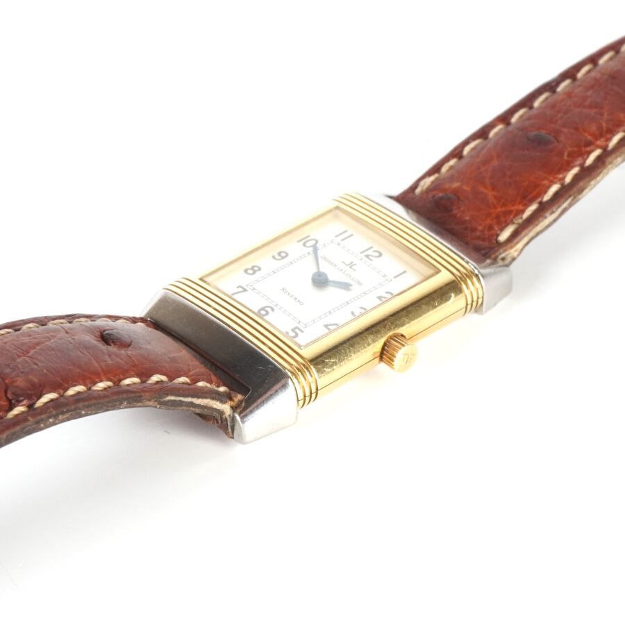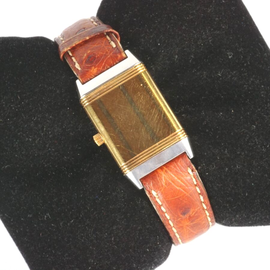 JAEGER LECOULTRE : Montre bracelet modèle "Reverso" en or jaune 18K (750/oo et acier chromé, boîtier en acier signé et numéroté, carrure en or à cadran réversible, cadran nacré et signé, chiffres arabes pour les heures, bracelet en cuir d'autruche brun signé, boucle ardillon en acier logoté, mouvement mécanique, Dim. Cadran : 1.3 x 1.6 cm. Dim. Boîtier : 2.9 x 1.9 cm. L. Totale : 20 cm environ. Poids brut : 28.8 g environ (usures au bracelet).