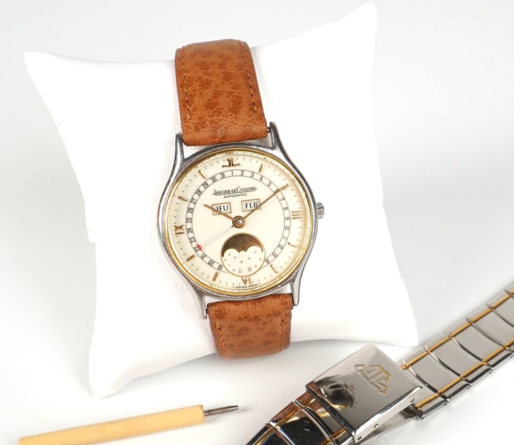 JAEGER-LECOULTRE : Montre d'homme modèle "Odysseus", boîtier rond en or jaune 18K (750/oo) et acier, 33 mm, fond numéroté 145.119.5, cadran fond ivoire, à quantième mensuel et phases de lune, guichets des jours et mois à midi, aiguille flèche indiquant la date, mouvement mécanique à remontage automatique, bracelet cuir havane rapporté, boucle déployante.