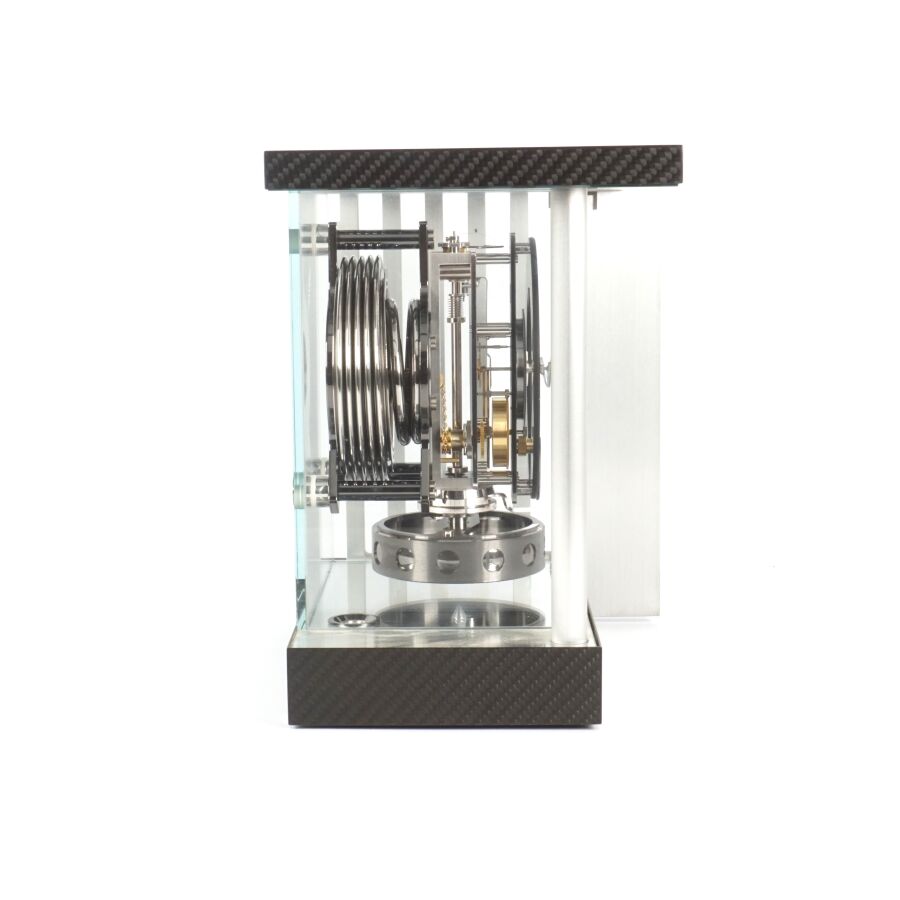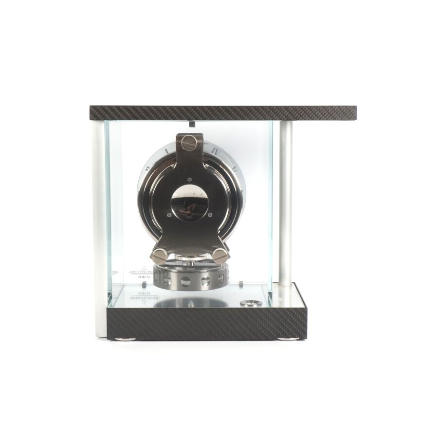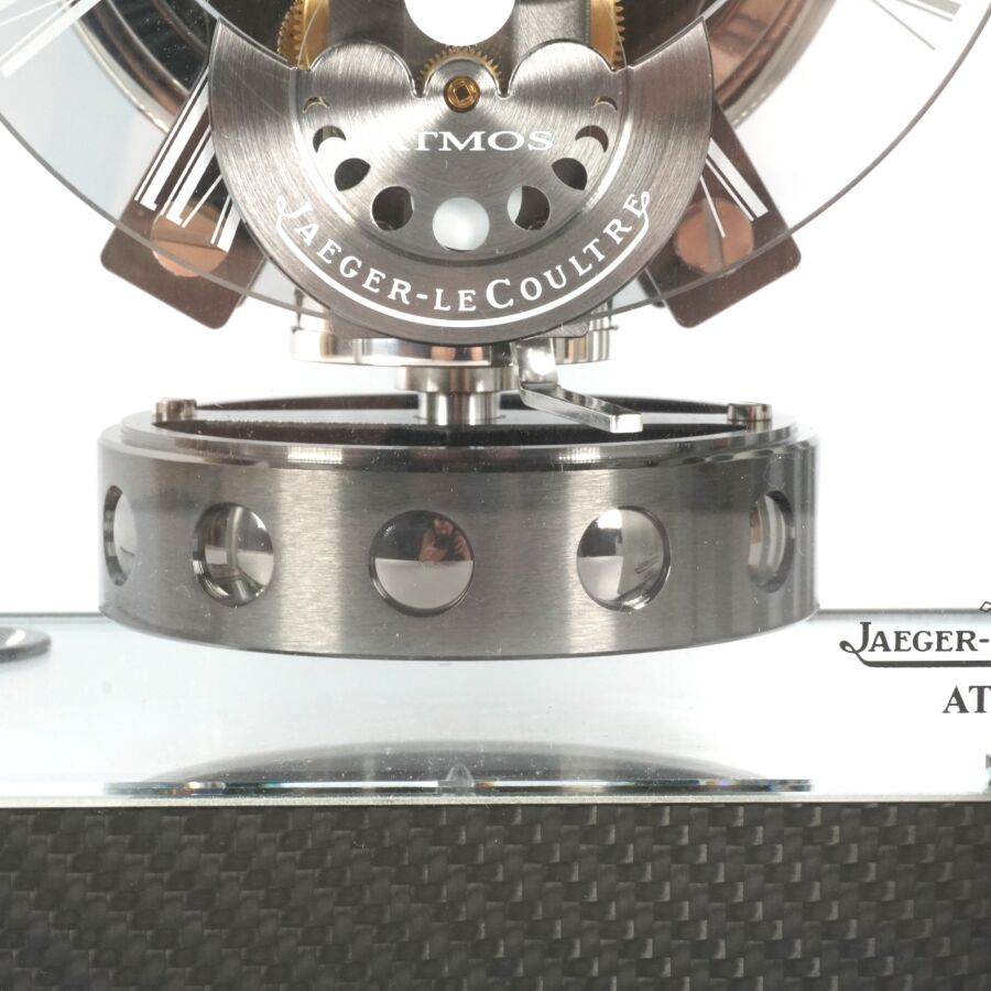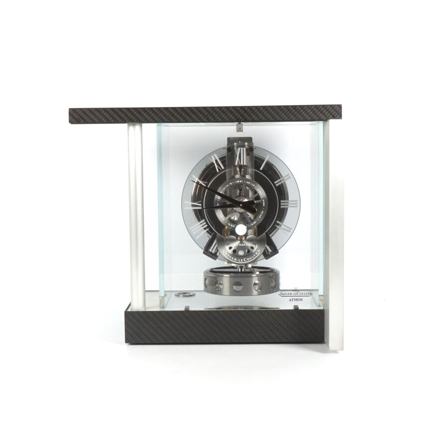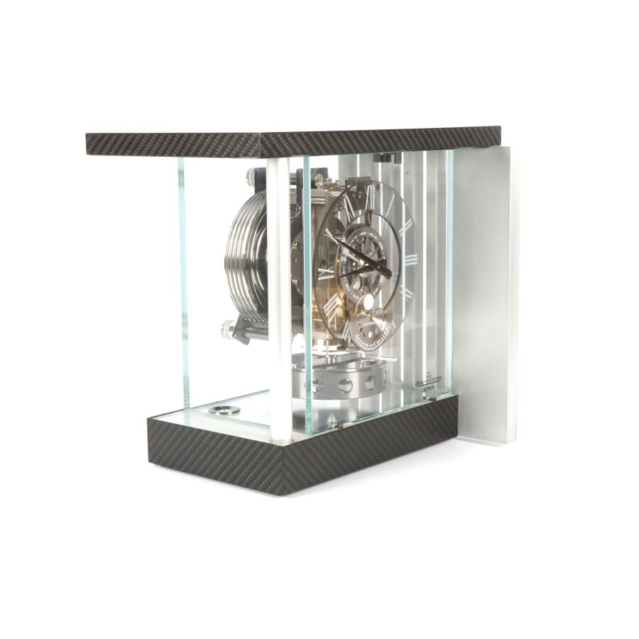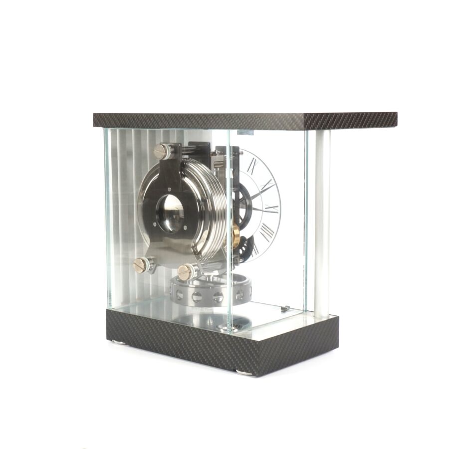 JAEGER - LECOULTRE : Rare pendule "Atmos - Pavillon", structure en cristal, aluminium brossé et carbone satiné, cadran en rhuténium signé en blanc, chiffres romains pour les heures, mécanisme pour les mois et phases de lune, n° de série 731653, Dim; 25.5 x 28 x 18.5 cm (parfait état, en état de fonctionnement).