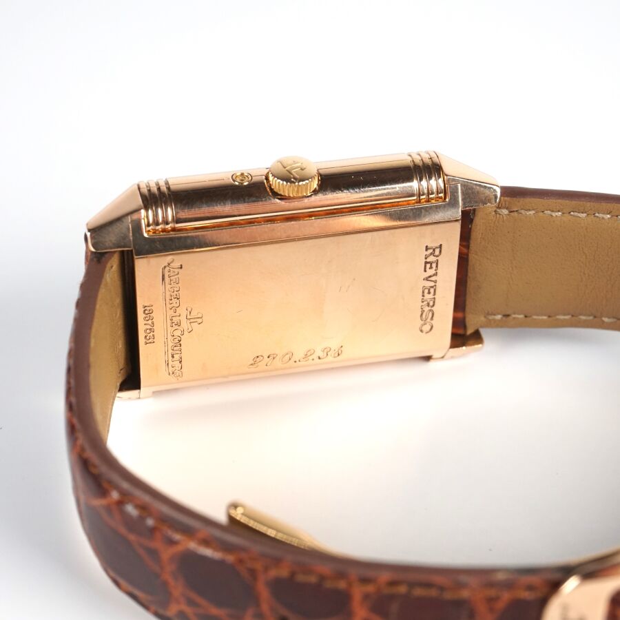 JAEGER LECOULTRE : "Reverso - Grande taille", montre bracelet, le boitier rectangulaire réversible en or jaune 18K (750//oo) à fond clippé, n° 270.2.36 / 1867531, cadran blanc et argenté signé, chiffres arabes pour les heures, jour de la semaine en anglais par guichet à 11 heures, chemin de fer avec calendrier indiqué par l'aiguille rouge et compteur des secondes à 6 heures, mouvement mécanique à remontage manuel, revers du boîtier gravé à motif d'un blason couronné et d'une main armée, bracelet crocodile brun, boucle déployante en or jaune 18K (750/oo) signée, Dim. Cadran (hors lunette) : 1.8 x 2.3 cm. Dim. Boitier : 2.6 x 3 cm. L. Poids brut : 85 g environ.