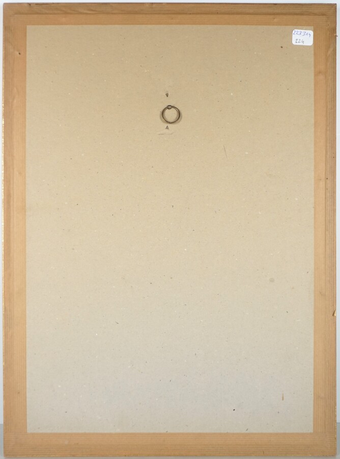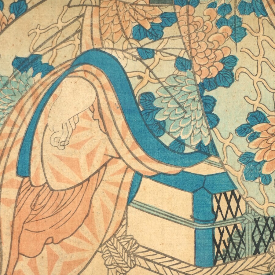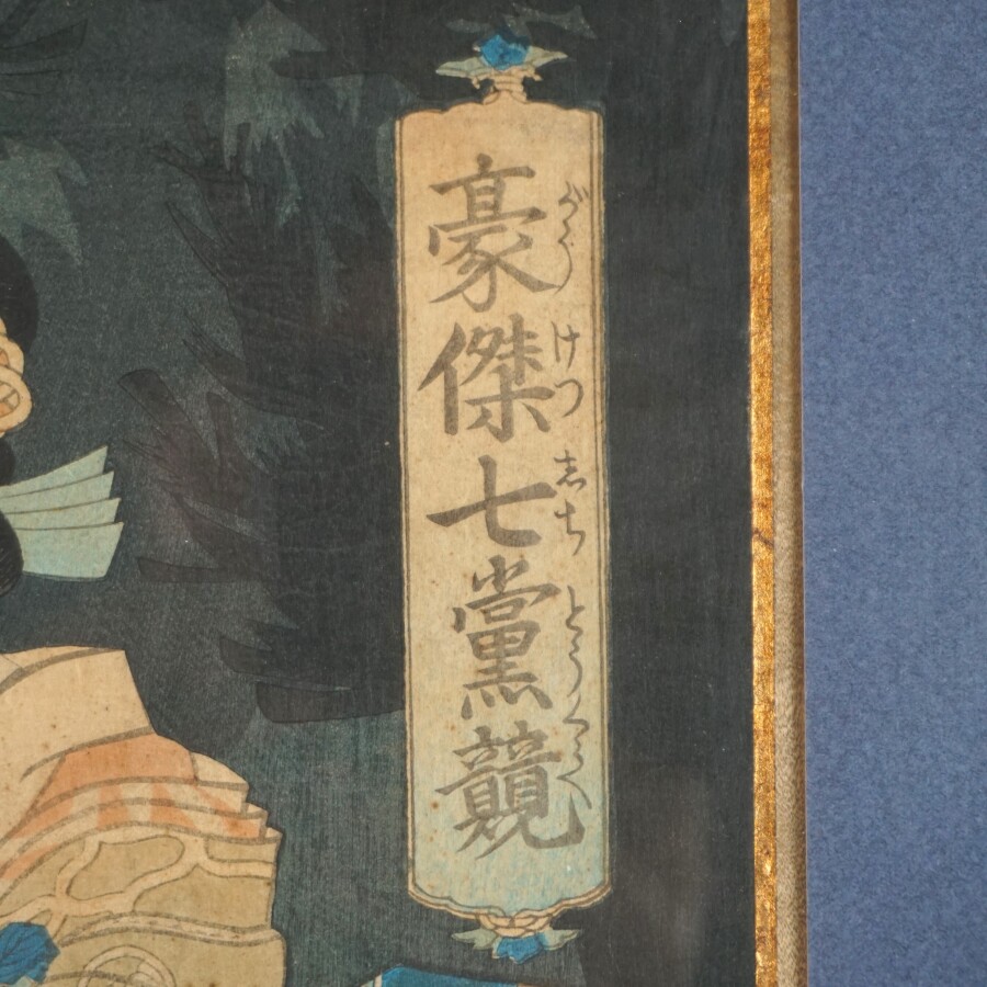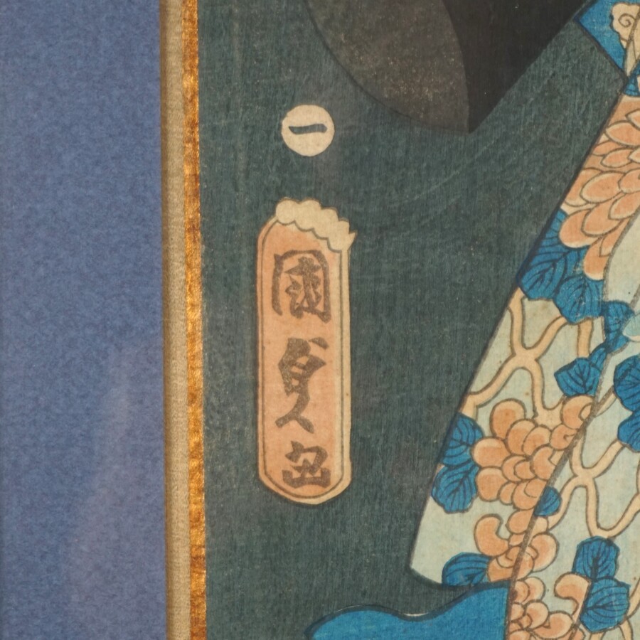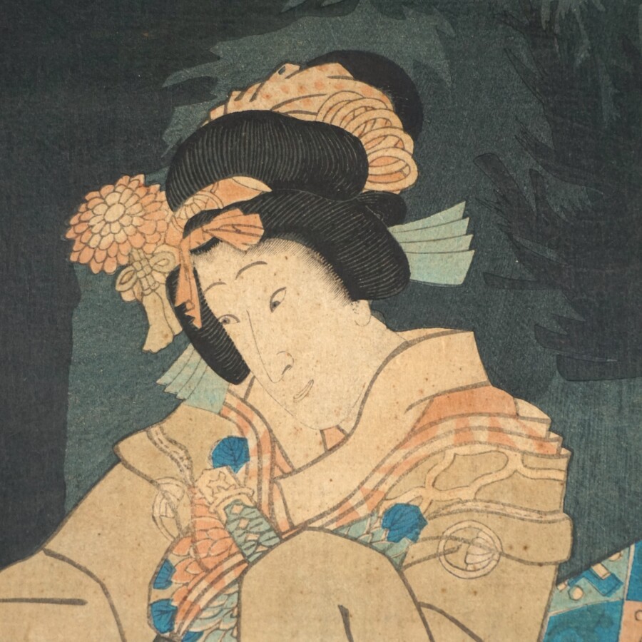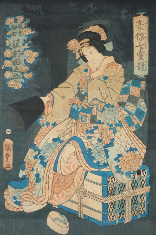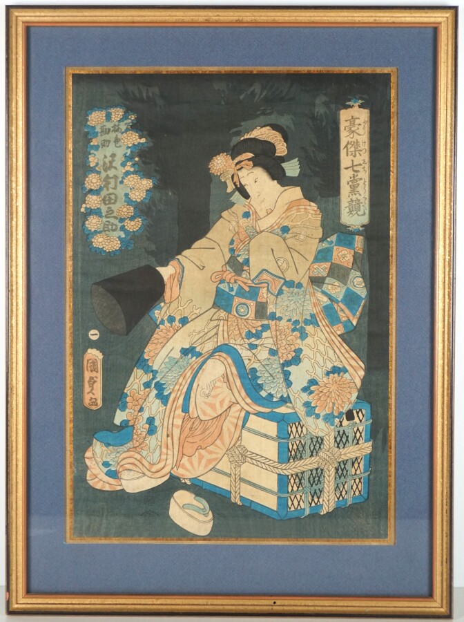 Japon, période Meiji 6, Estampe représentant une jeune femme assise sur une malle, signée en bas à gauche Kunisada II (1823-1880), Dim à vue. 37 x 25 cm.