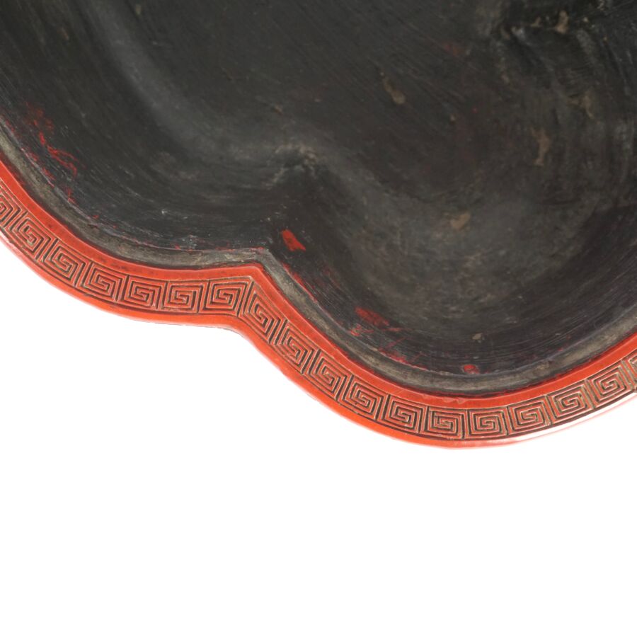Jardinière polylobée en laque de Cinabre à décor de scènes de personnages en quatre médaillons sur fond de lotus, Chine, circa 1900, L. 26 cm. H. 9.5 cm (sauts de laque, petit manque en bordure).