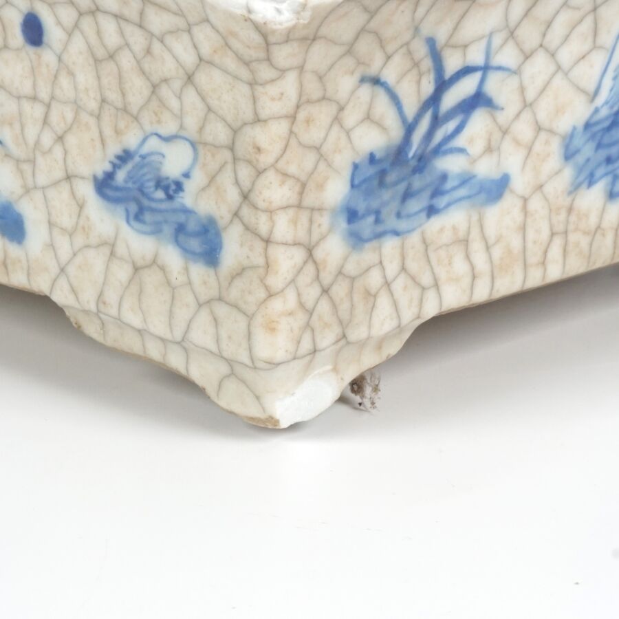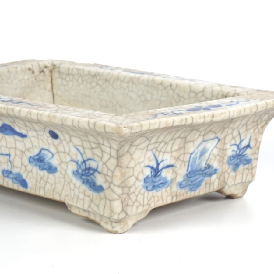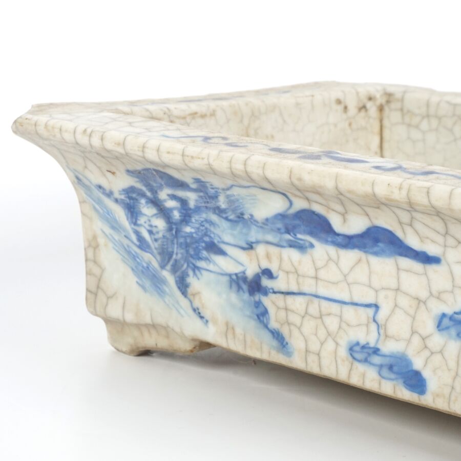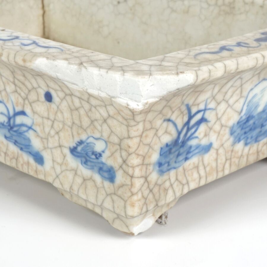 Jardinière quadrangulaire, en porcelaine émaillée craquelée beige, à décor en bleu, de paysages lacustres.