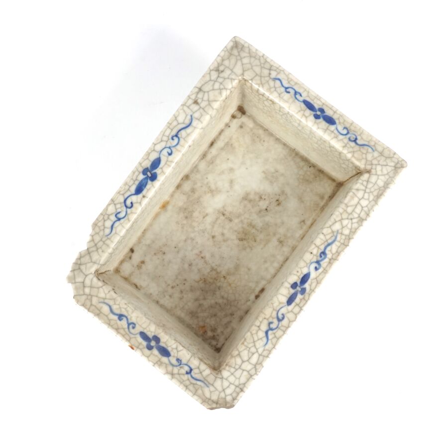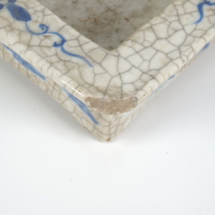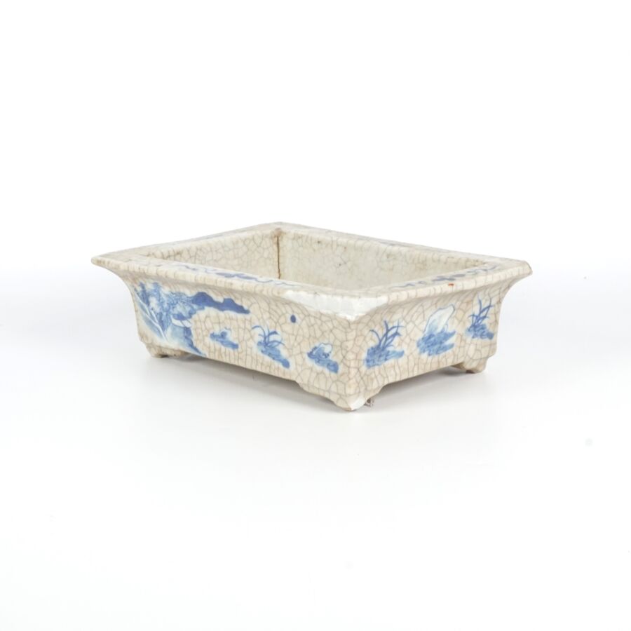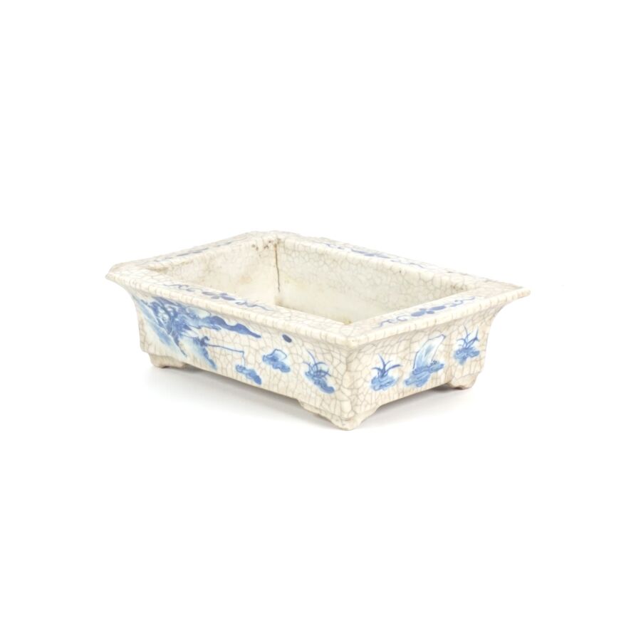 Jardinière quadrangulaire, en porcelaine émaillée craquelée beige, à décor en bleu, de paysages lacustres.