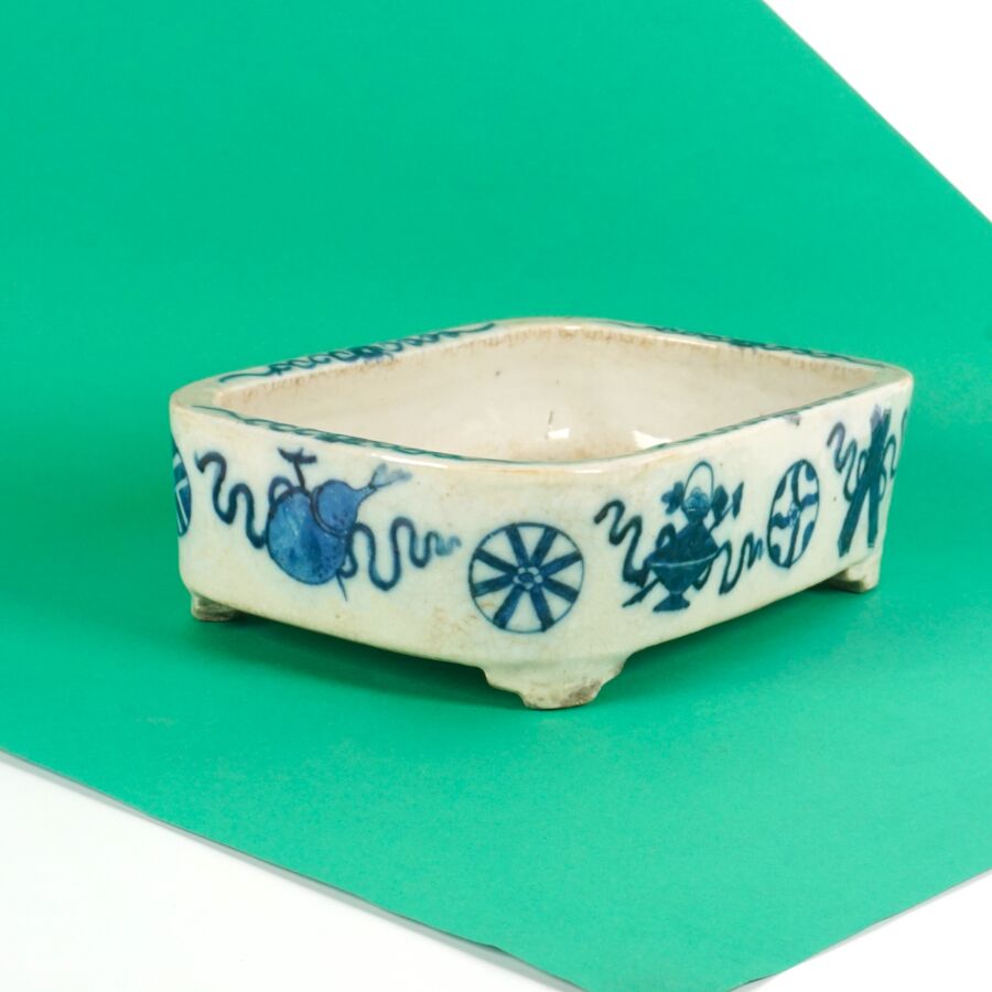 Jardinière rectangulaire, en porcelaine émaillée craquelée beige, à décor en bleu, de motifs géométriques stylisés en médaillons et motifs de coloquinte, éventail, vase garni de fleurs, Chine, fin du 19ème siècle, H. 6.9 x 24.2 x 15.5 cm.