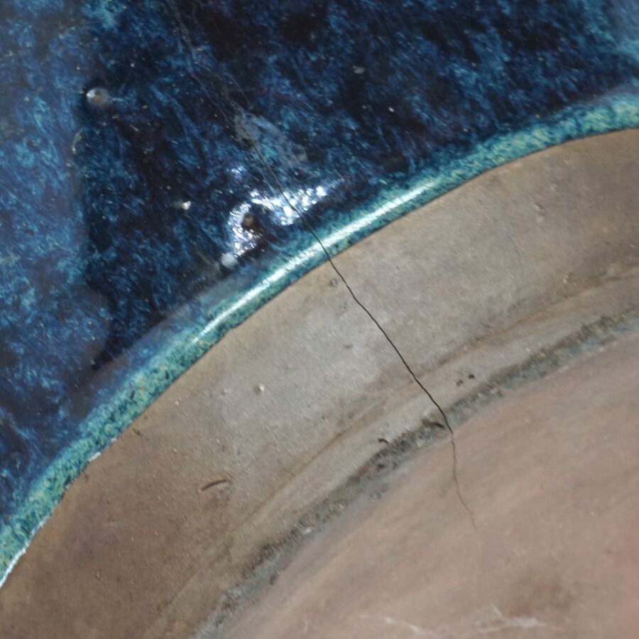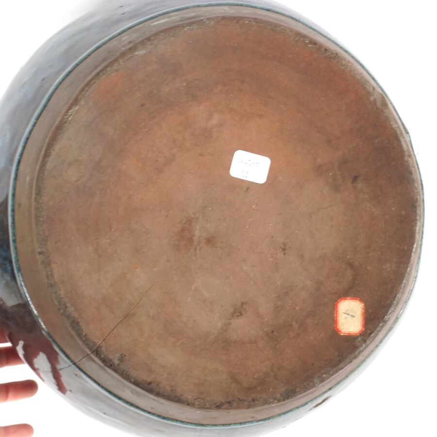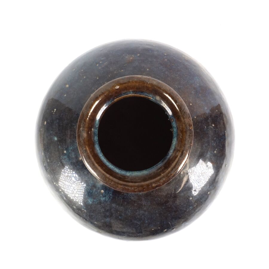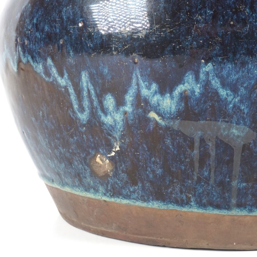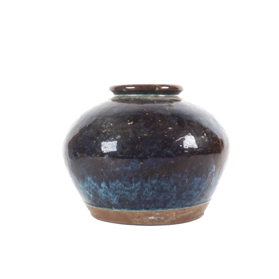 Jarre à panse large et col retroussé, en grès émaillé bleu et aubergine, Chine, 20ème siècle, H. 25.5 cm (fêle de cuisson dessous).