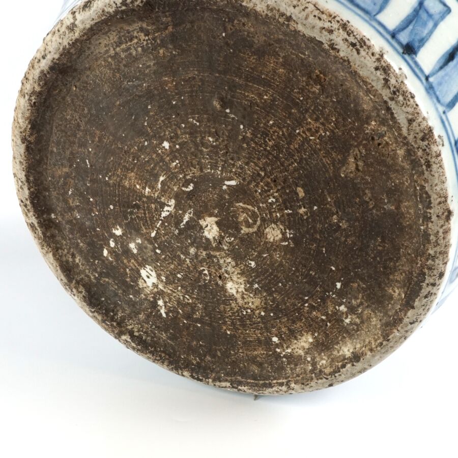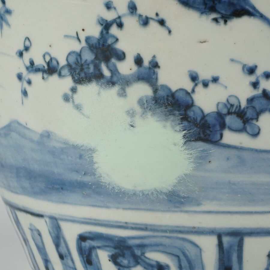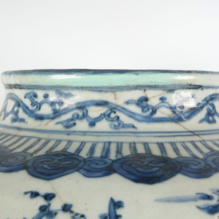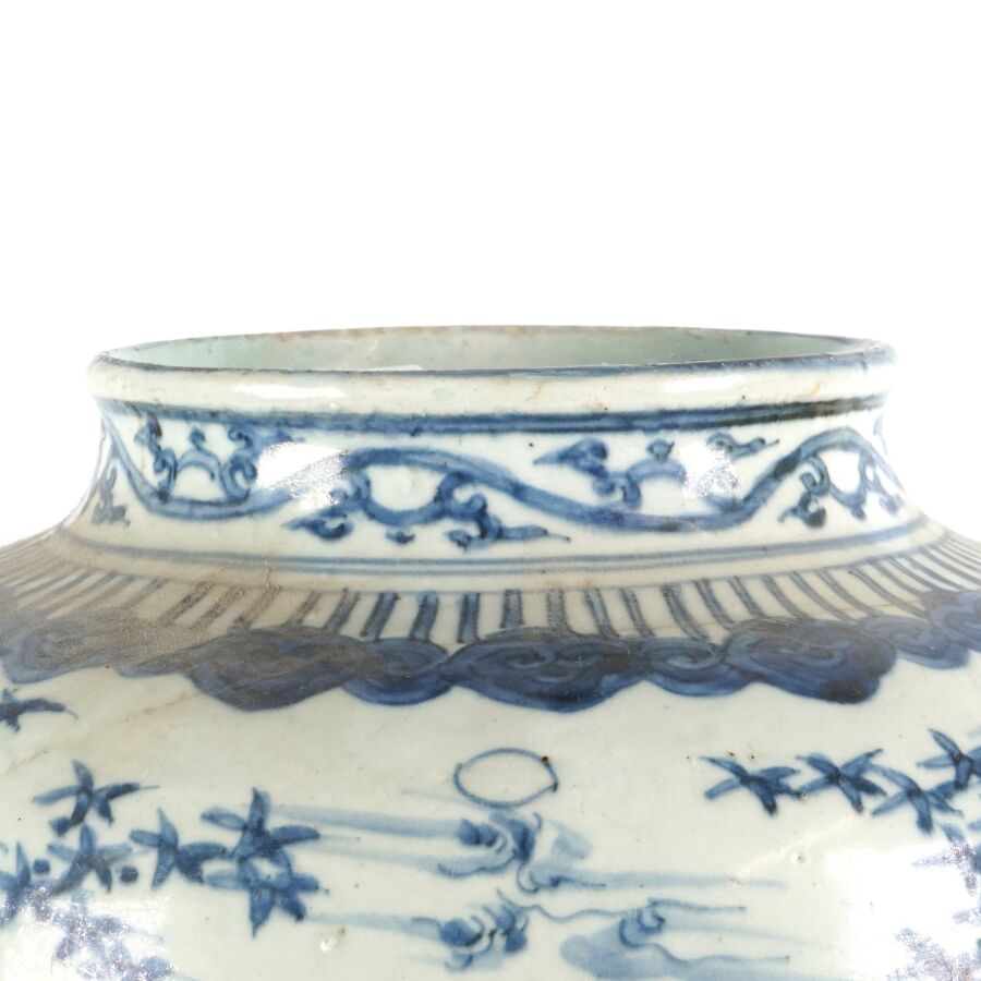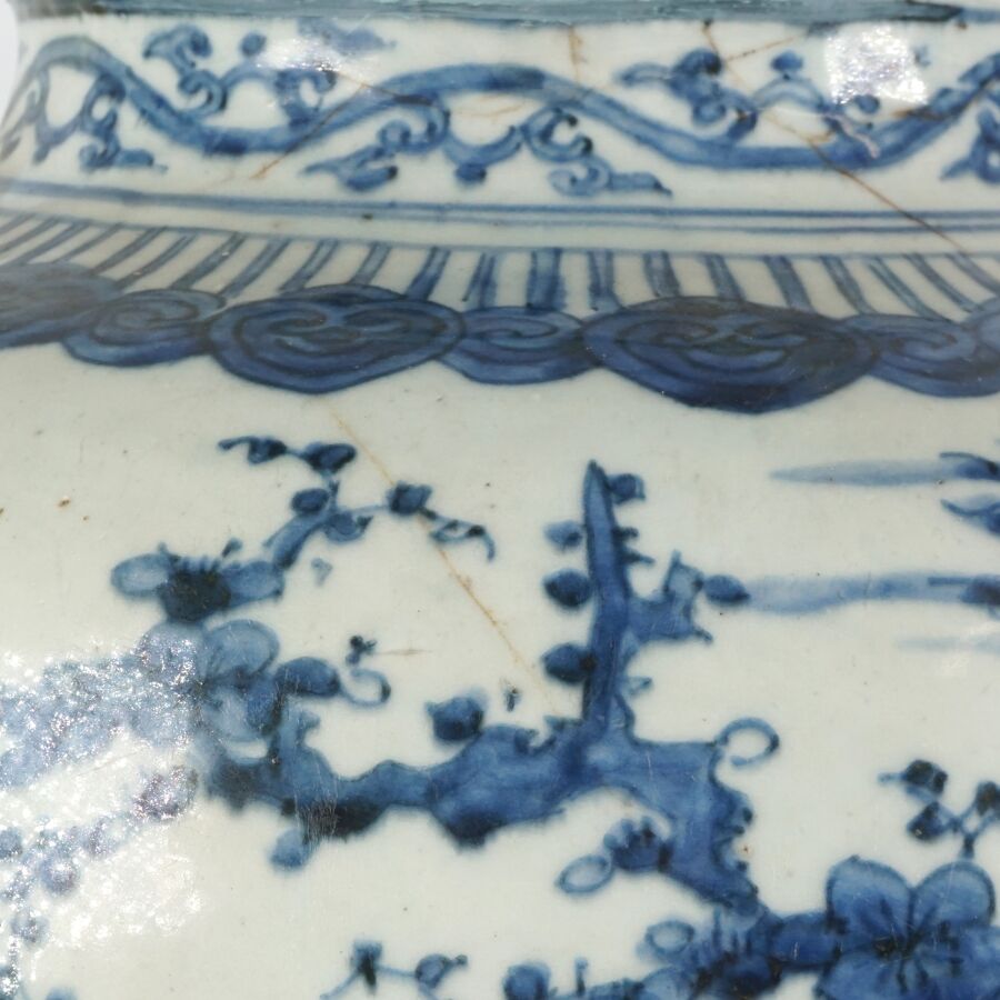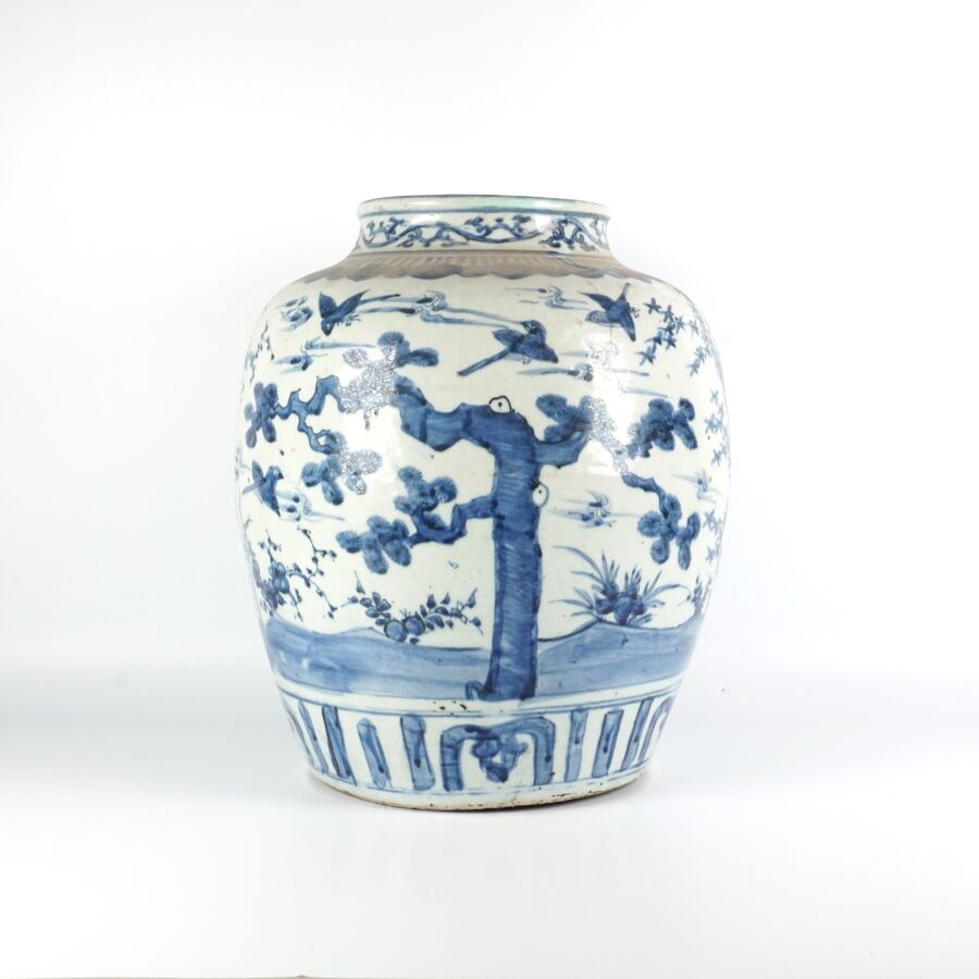 Jarre de forme balustre, en porcelaine émaillée bleu blanc, à décor d'oiseaux parmi les trois amis de l'hiver, pins, bambou et prunus, lingzhi. Des pétales de lotus apposés en panneaux complètent l'ornementation du talon. Le pourtour du col orné d'une guirlandes de ruyi et rinceaux feuillagés, Chine, 17ème siècle, H. 38 cm (fêles, restauration au col et sur la panse).