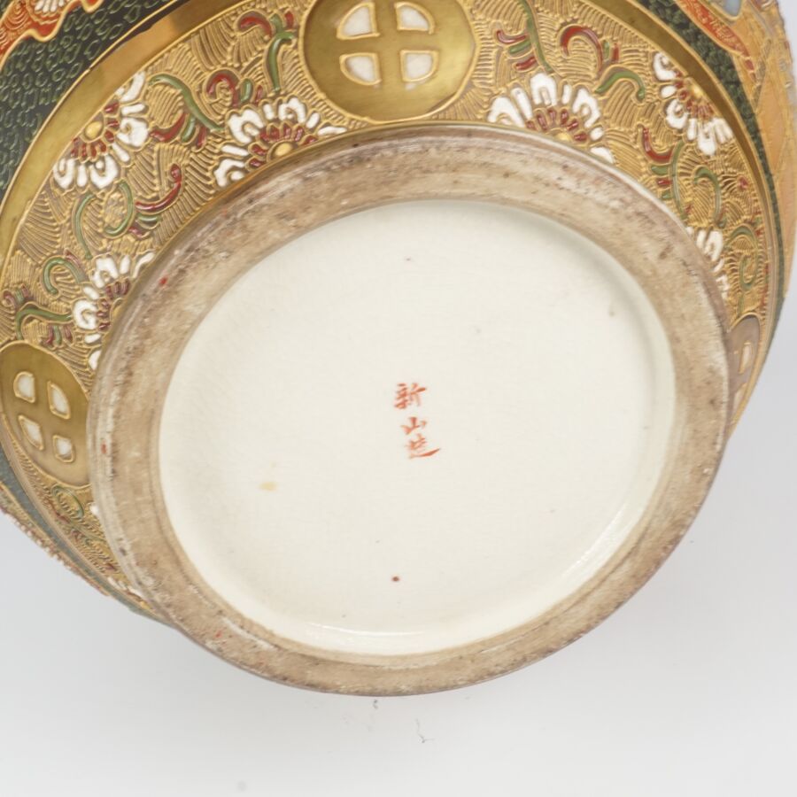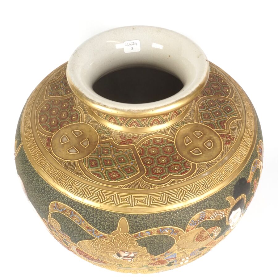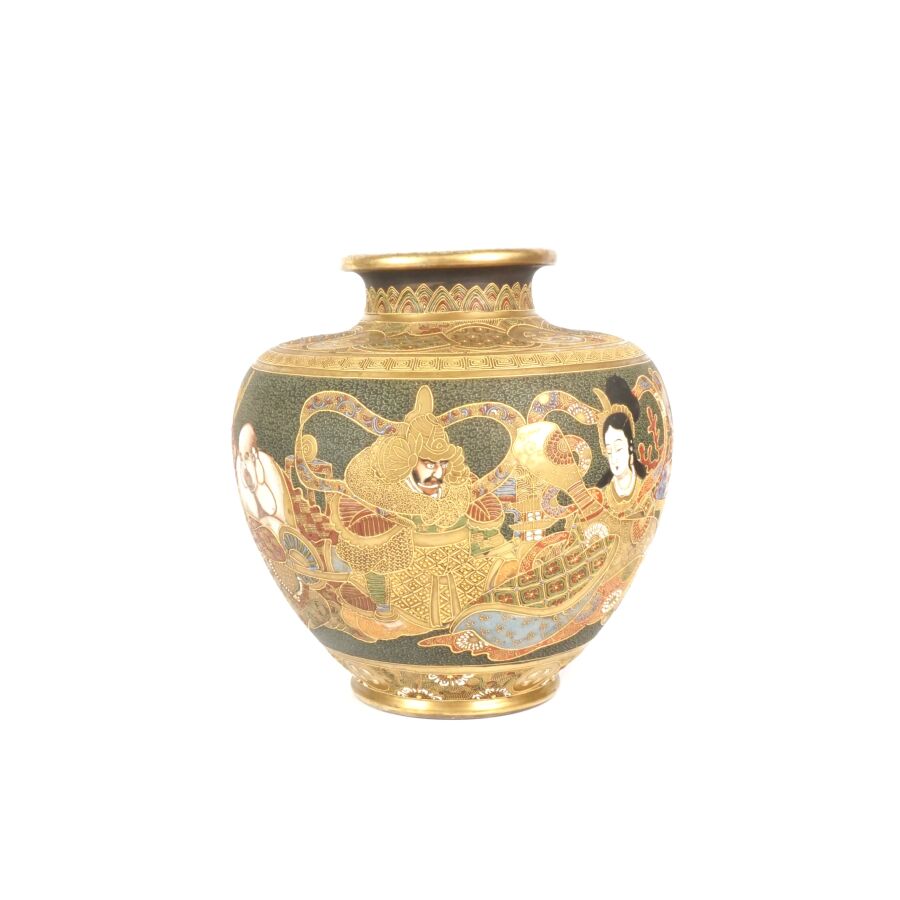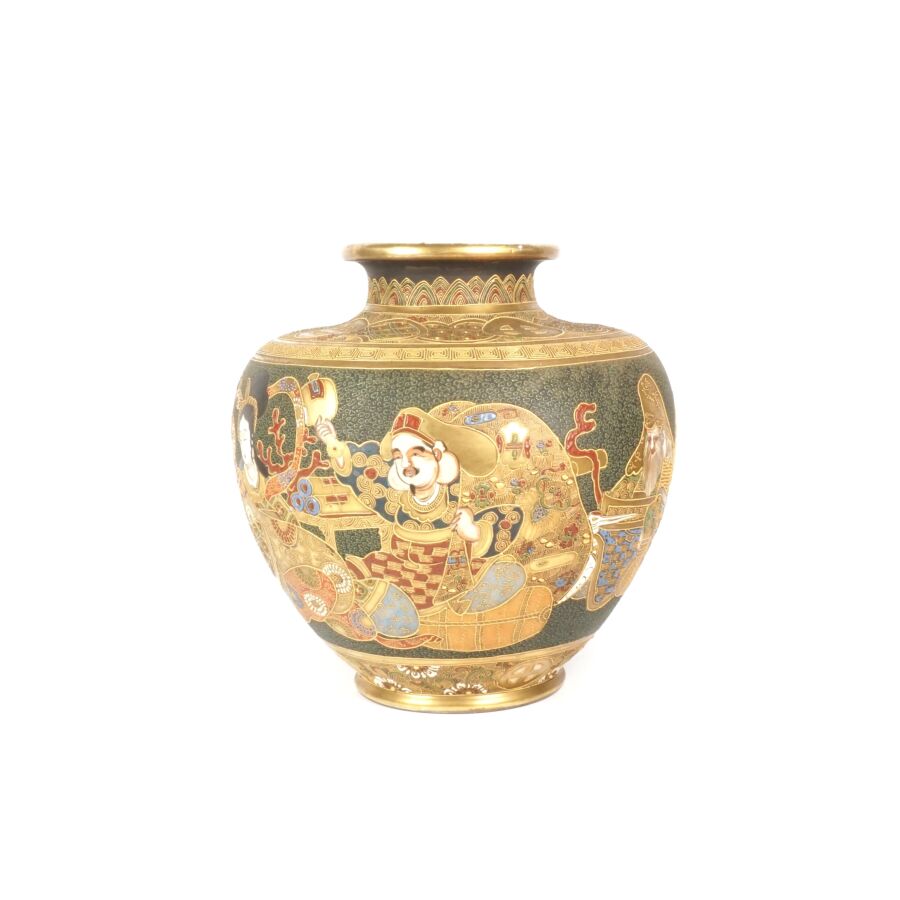 Jarre en porcelaine émaillée polychrome et rehauts d'or à décor de personnages dont Daikoku, Japon, Satsuma, circa 1920, H. 36 cm.