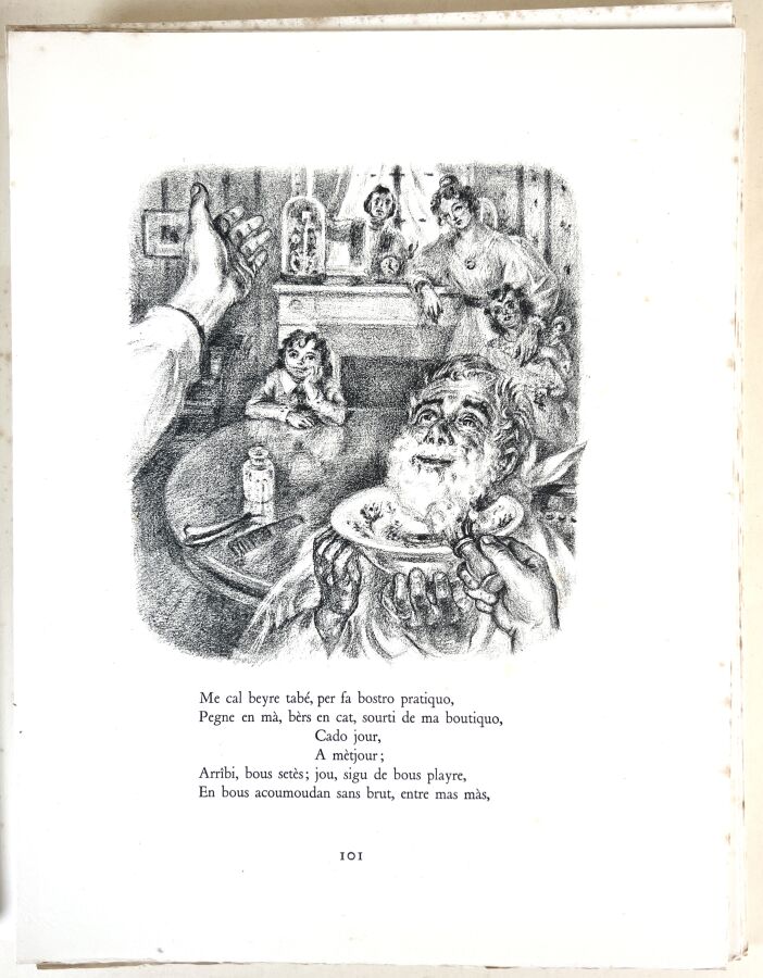 JASMIN (pseudonyme de Jacques Boé) - Las Papillotos de Jasmin, coiffur - [Paris] ; Les Jasmins de Paris, 1948 - 1 volume grand In-4° en feuilles non coupé sous couverture rempliée illustrée au 1er plat (emboîtage probablement manquant) - Des rousseurs, principalement en début de volume et aux tranches - Ouvrage en langue occitane - Frontispice et illustrations in texte de Jean Terles lithographiés en noir - Bon exemplaire sur vélin Lana pur fil (n°VII sur les XX, tirage total : 595), avec la suite annoncée à la justification, enrichi de 4 dessins originaux signés au crayon, de 2 planches d'essais, d'envois autographes signés d'Henri Seguin, président des Jasmins de Paris, et de Jean Terles au faux titre : " A Mossu lou présiden de la Republico en soubenir de noste païs " et " A Monsieur le Président Auriol Hommage respectueux " et accompagné d'1 lettre dactylographiée de Henri Seguin à Vincent Auriol.