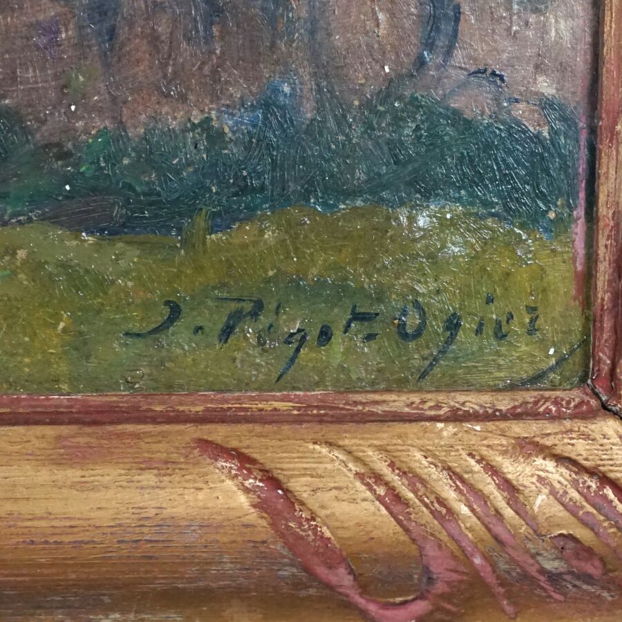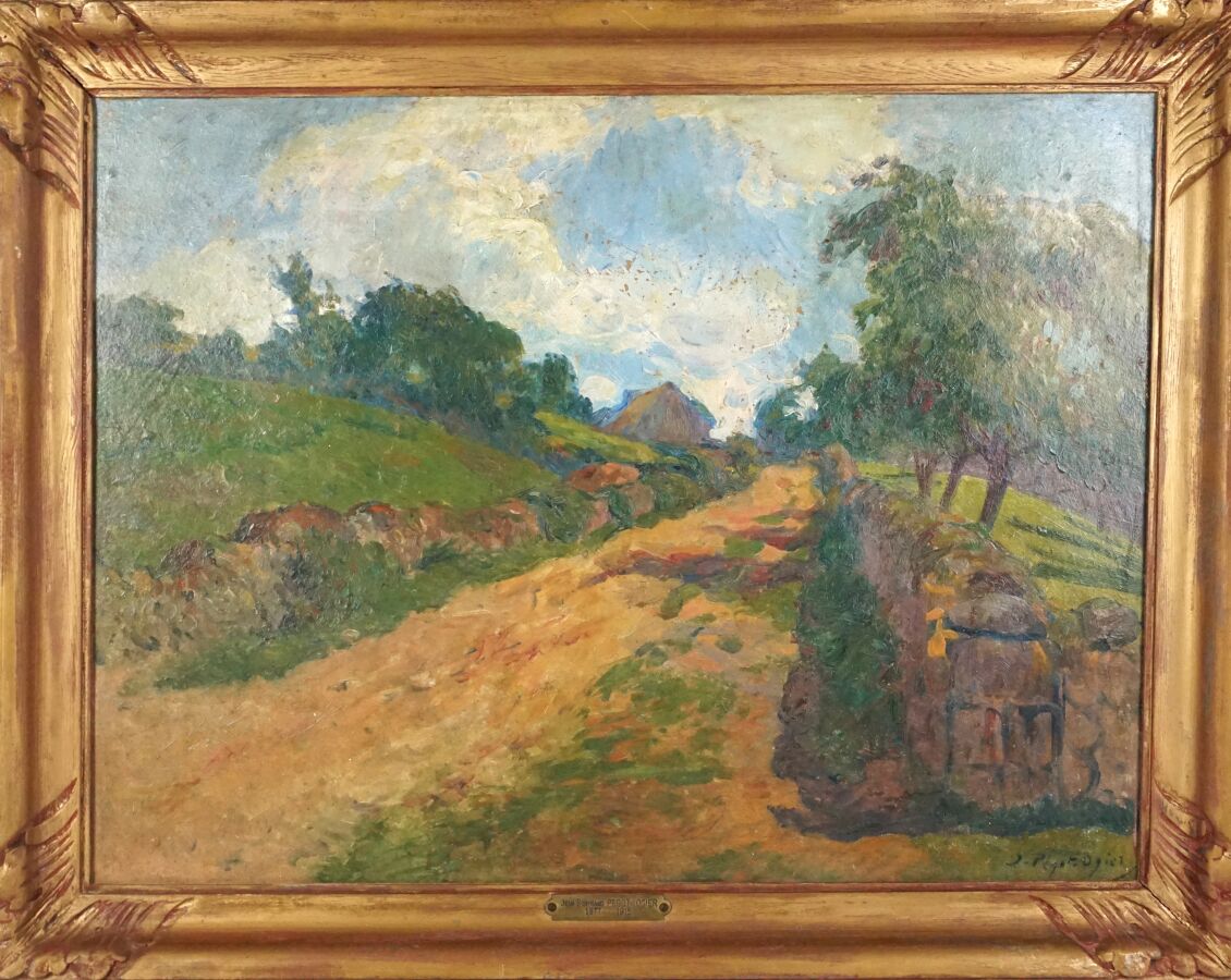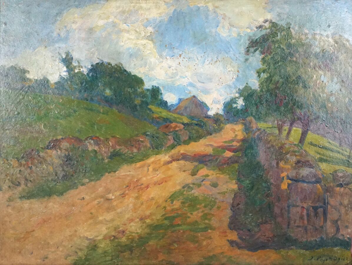Jean-Bertrand PEGOT-OGIER (1877-1915), "Chemin vers la chaumière à Pont-Scorff", huile sur carton signée en bas à droite, 46.5 x 61 cm.