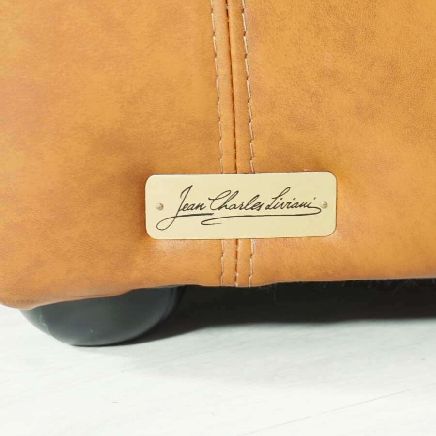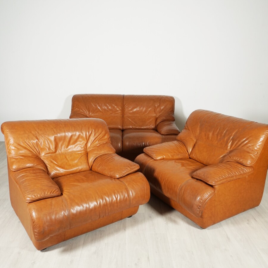 Jean-Charles LIVIANI (XXe) : Salon composé d'un canapé deux places et de deux fauteuils en cuir havane, L. 180 cm et 90 cm environ (quelques usures d'usage).