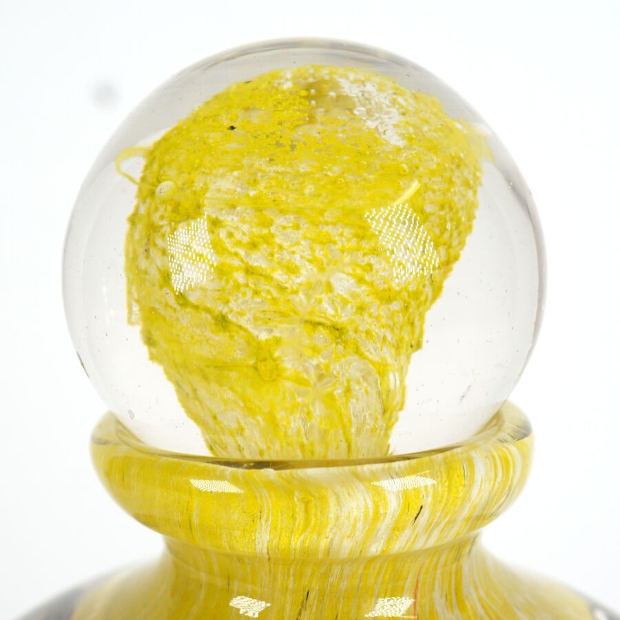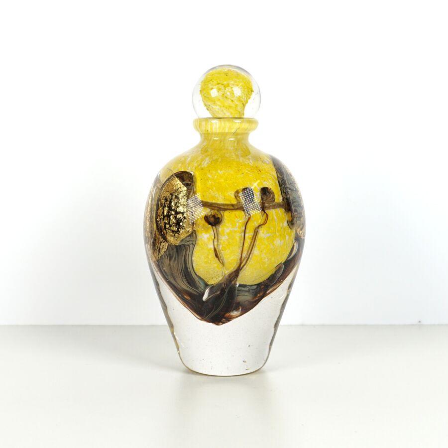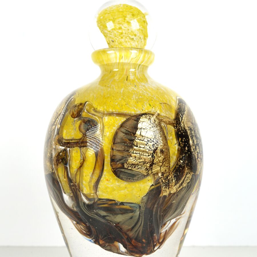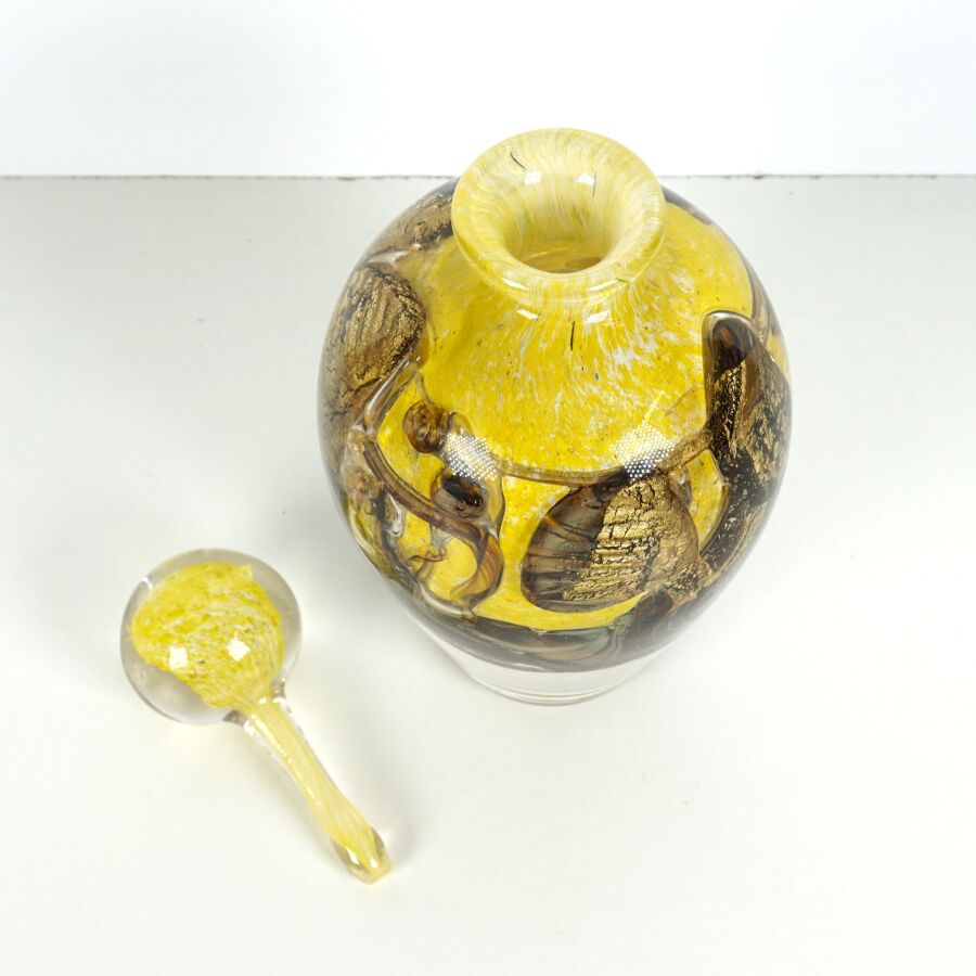 Jean-Claude NOVARO (1943-2014) : Vase de forme balustre en verre soufflé multicouches dans les tons jaunes et bruns, signé et daté 2006 sous la base, présenté avec son bouchon, H. 24 cm.