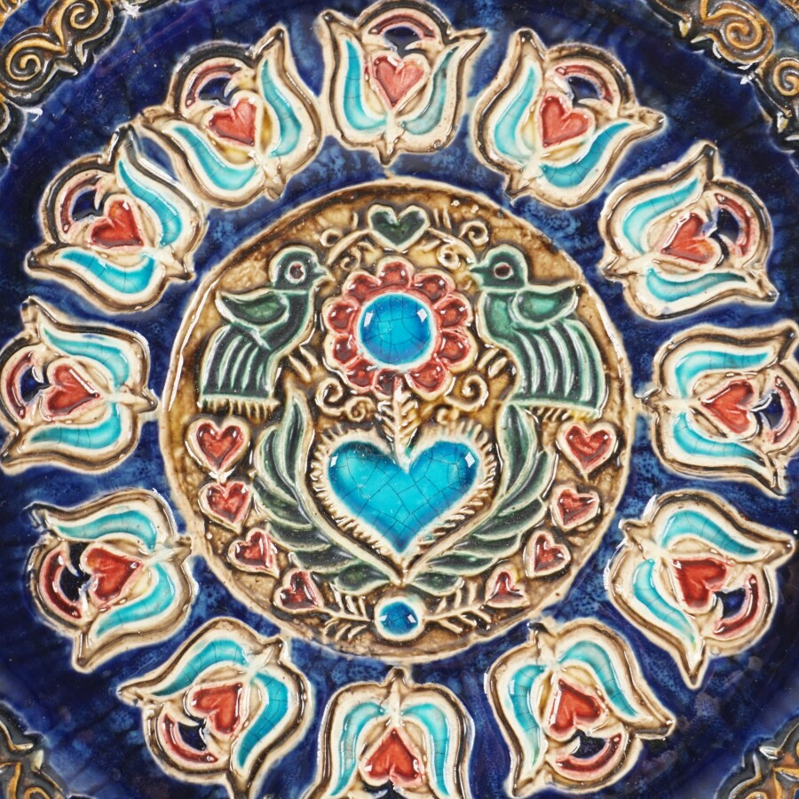Jean-Claude TABURET (1926-2013), assiette en faïence émaillée polychrome, à décor de fleurs et d'oiseaux branchés, l'aile ornée de frises géométriques, signée au dos, D. 20.5 cm.