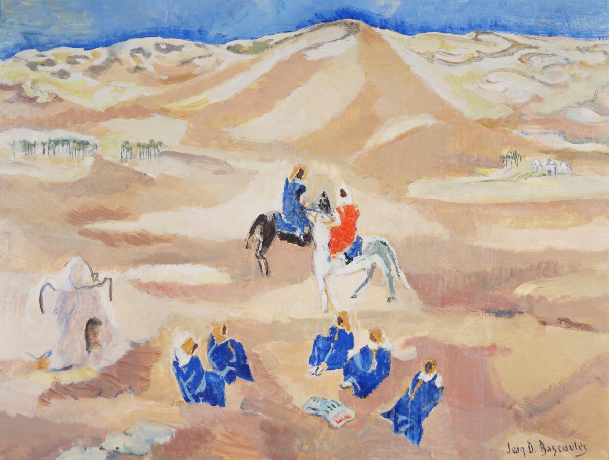 Jean-Désiré BASCOULES (1886-1976), "Bédouins dans le désert", huile sur carton signée en bas à droite, 53 x 68 cm.