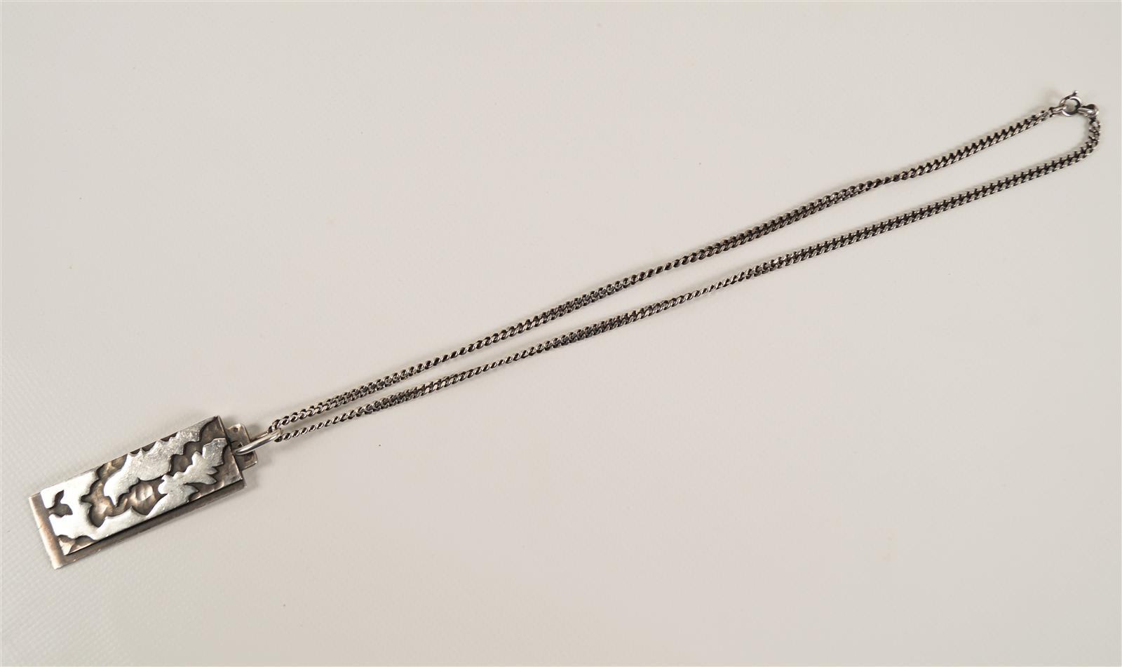 Jean DESPRES (1889-1980) : Pendentif rectangulaire et sa chaîne en argent, poinçon crabe, signé au dos, H. 6.5 cm, L. de la chaîne : 52 cm. Poids brut : 59 g environ.