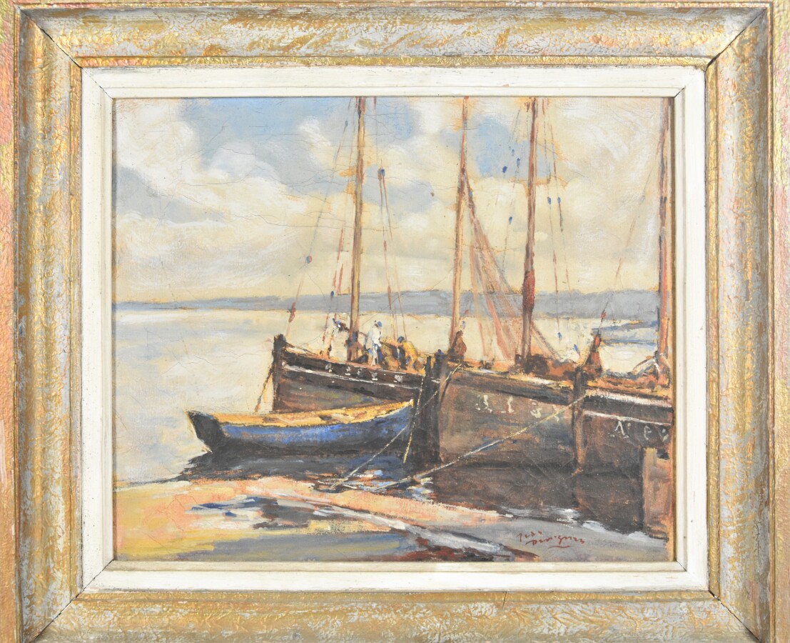 Jean DUVIGNAN (XXe), "Bateaux de pêche à quai", huile sur toile signée en bas droite, 37 x 45 cm (craquelures).