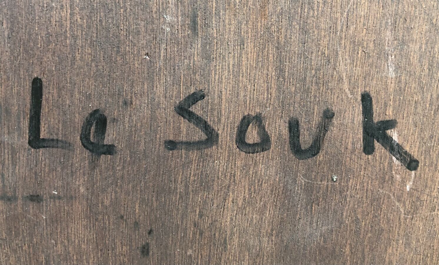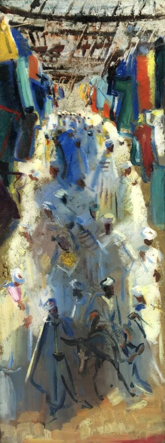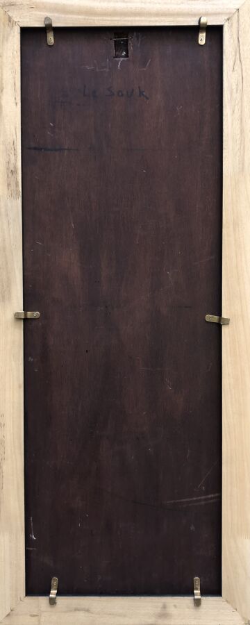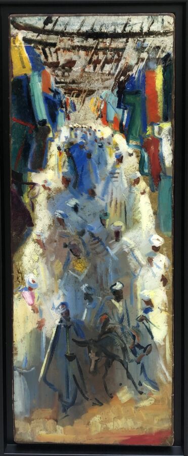 Jean Émile LAURENT (1906 -1983), "Le souk", huile sur panneau laqué signé en bas à droite et titré au dos, 105 x 39 cm.