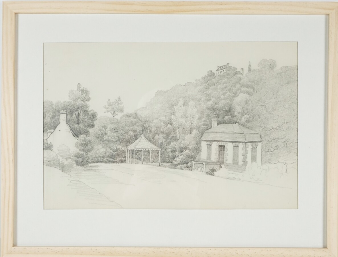 Jean-Félix SALNEUVE (1794-1862), "Dinan" et "Dinan, fontaine des eaux", deux dessins au crayon sur papier non signés, datés de 1856 et situé en bas sous la Marie-Louise, 20.6 x 31.5 cm et 20.6 x 31.4 cm (encadrés sous verre).