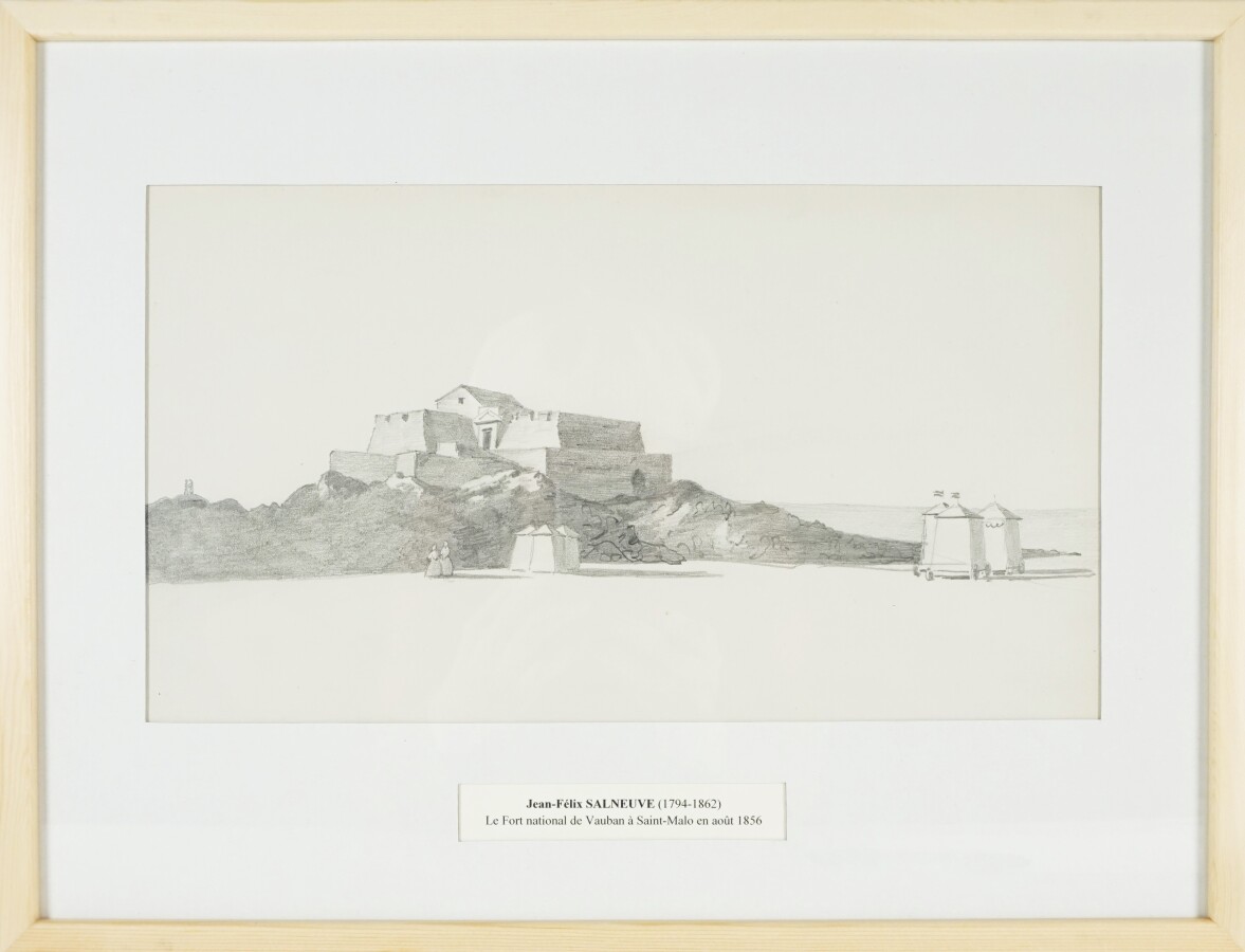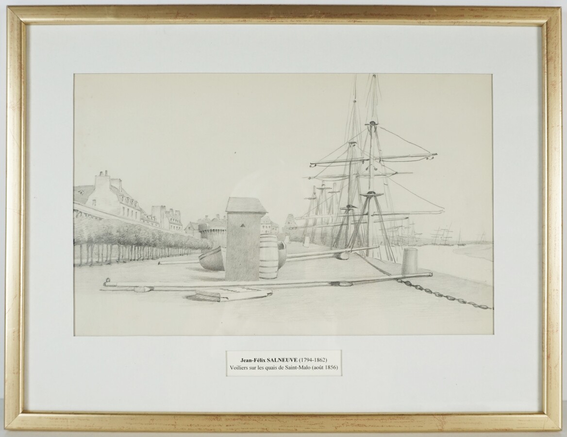 Jean-Félix SALNEUVE (1794-1862), "Voiliers sur les quais de Saint-Malo (Août 1856)", Saint-Malo, Les moulins et le calvaire" 1856, "L'estuaire de la Rance vu des remparts de Saint-Malo" 1856 et "Le Fort national de Vauban à Saint-Malo en août 1856", ensemble de 4 dessins au crayon sur papier, non signés, situés et datés sous la Marie-Louise, 17.5 x 31.5 cm et 20.5 x 31.5 cm.