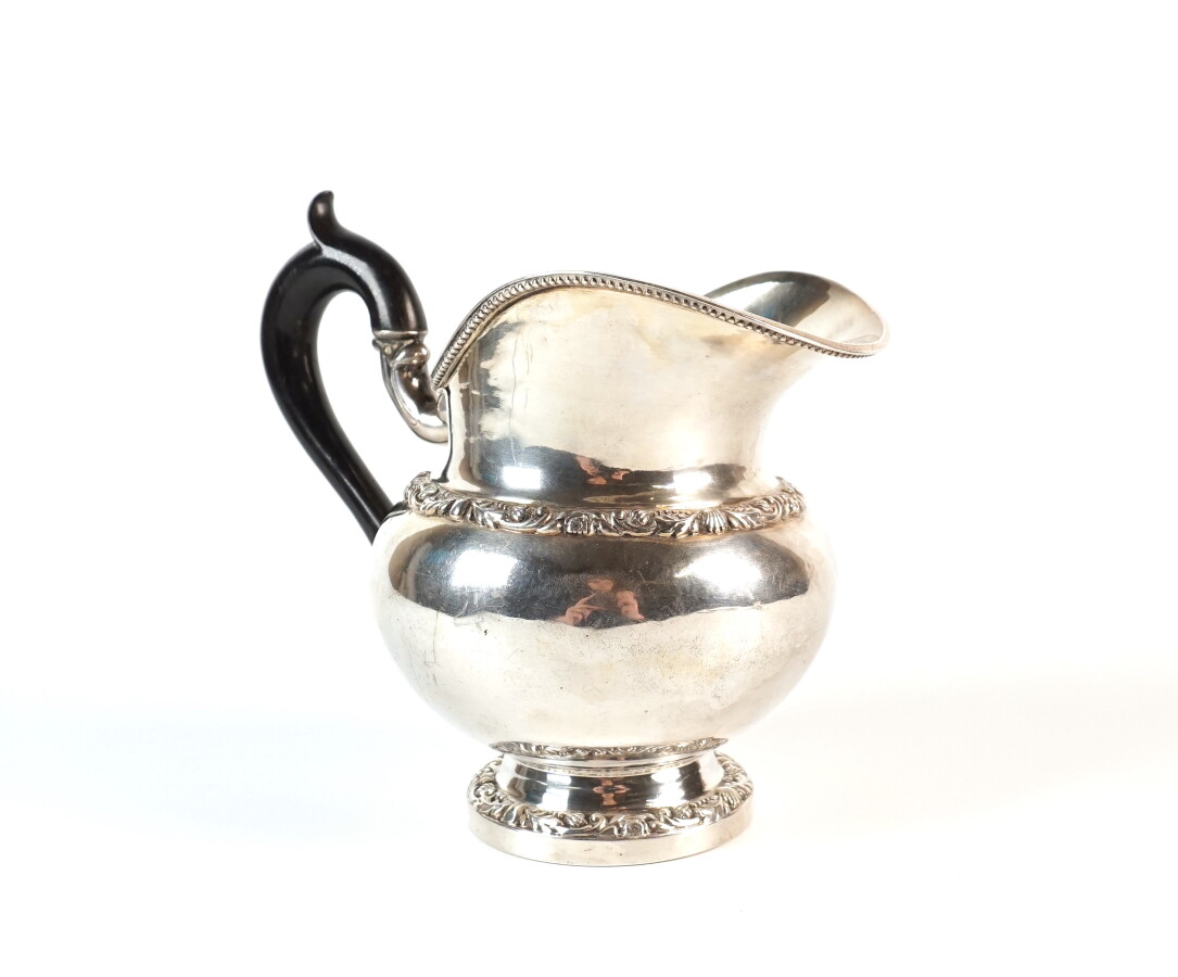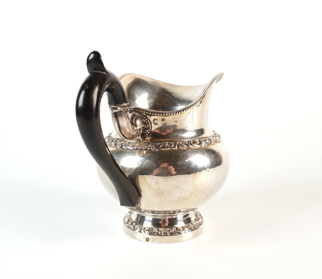Jean-François VEYRAT (1831-1840) : Elégant pot à lait sur piédouche en argent, poinçon Michel-Ange (1819-1838) grosse garantie Paris, orné d'une frise de perles et de frises de fleurs, feuillages et coquilles, l'anse en bois, époque Restauration, H. 14 cm. Poids brut : 220 g environ.