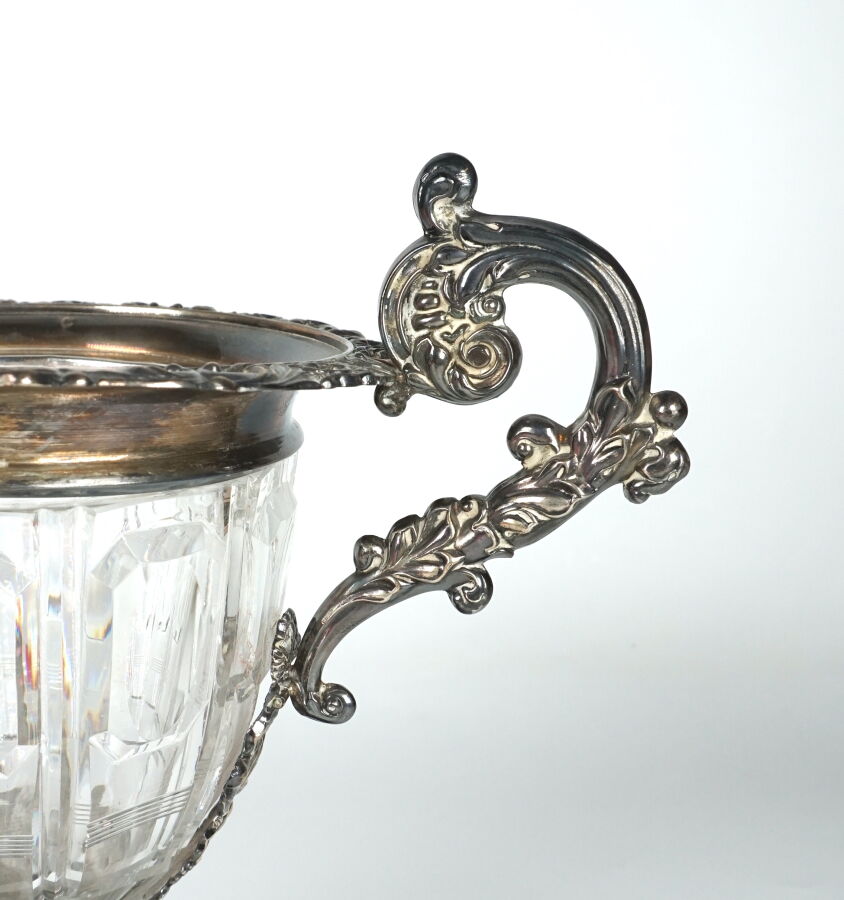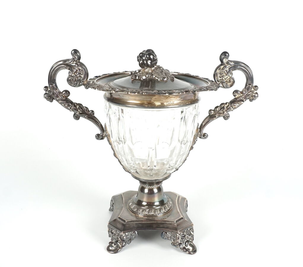 Jean-François VEYRAT (1831-1840) : Joli drageoir sur piédouche en argent, poinçon Minerve 1er titre, la monture à décor de coquilles, fleurs et feuillages accueillant une coupe ovoïde en verre taillé, les anses en enroulements terminant par une ornementation de vigne et de roseaux, le couvercle agrémenté d'une frise de perles et d'un fretel formant une courge, il repose sur une base carrée à pans coupés, terminant par 4 petits pieds feuillagés, H. 22.5 cm. Poids brut : 878 g environ.