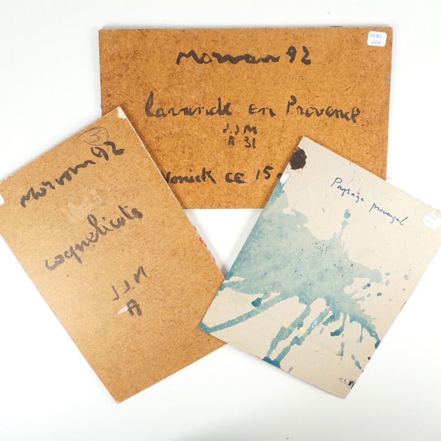 Jean-Jacques MORVAN (1928-2005), "Lavande en Provence" 92, "Paysage provençal" et "Coquelicots" 92, trois huiles sur carton et matière composite, signées en bas, deux à l'ancre de marine, contresignées, datées et titrées au dos, 21.5 x 35 cm, 27.8 x 22.3 cm et 32.8 x 21.5 cm.
