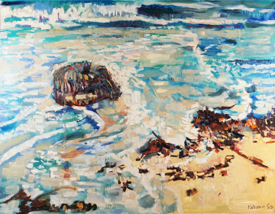 Jean-Jacques MORVAN (1928-2005), "Le panier à langouste, Bretagne" huile sur panneau, signée datée 63 en bas à droite, contresignée, titrée et datée 62 au dos, 114.5 x 146 cm.